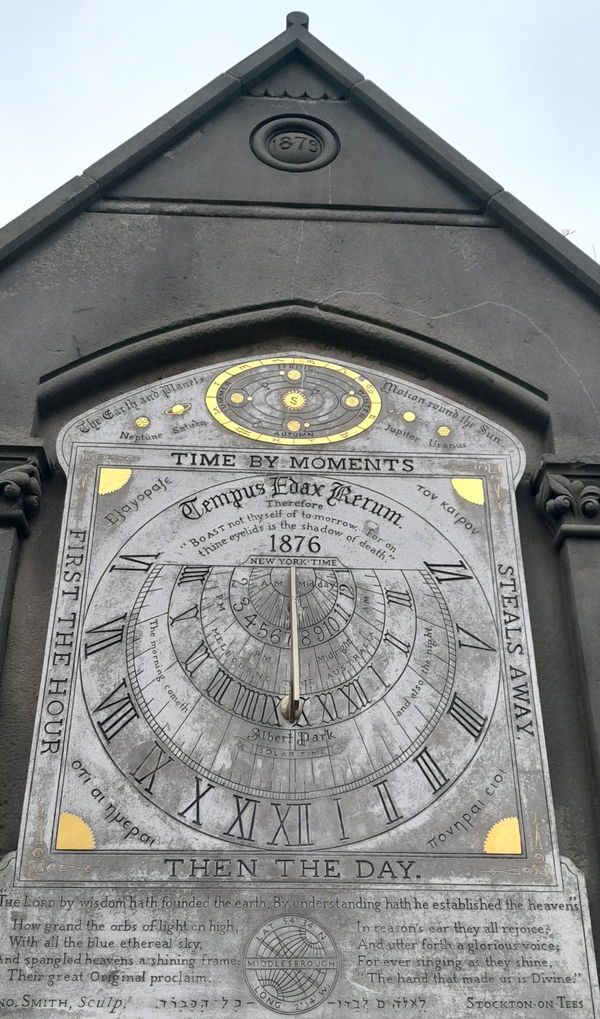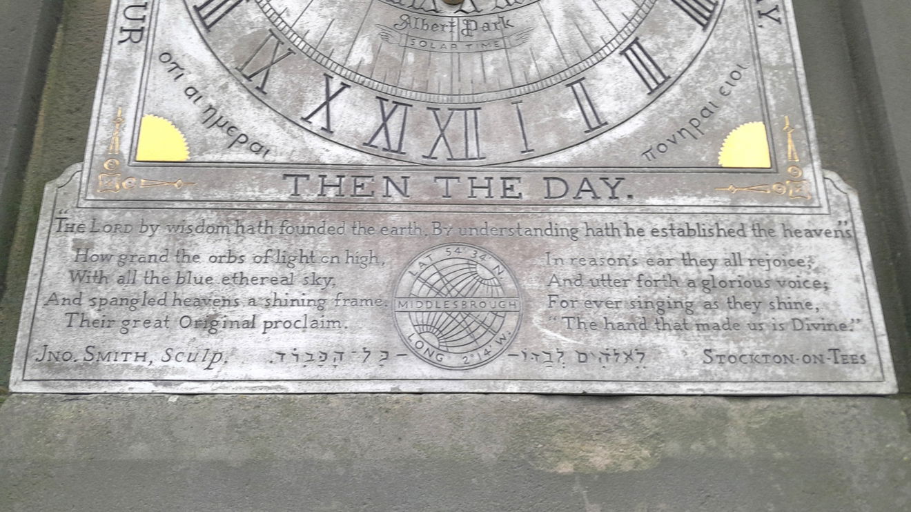 The dial at the West entrance of the park has mottoes that read: "First the hour then the day, Time by moments steals away", "Tempus Edax Rerum", "Therefore boast not thyself of tomorrow for on thine eyelids is the shadow of death", "The watchman by hand and fingers says the morning cometh and also the light". Also Greek and Hebrew mottoes, an eight line paraphrase of Psalm XIX by the poet Addison, and an inscription. History of Middlesbrough, Chap XVIII. Time in New York, Australia and Middlesbrough. Date later confirmed as 1876. ref Gatty. John Smith's earlier dial to a simpler version of this design is at Halifax, see SRN 7508.