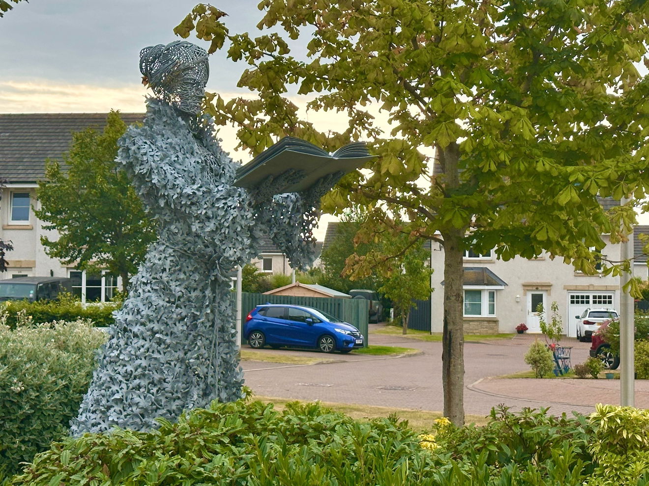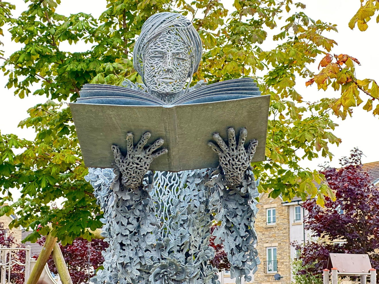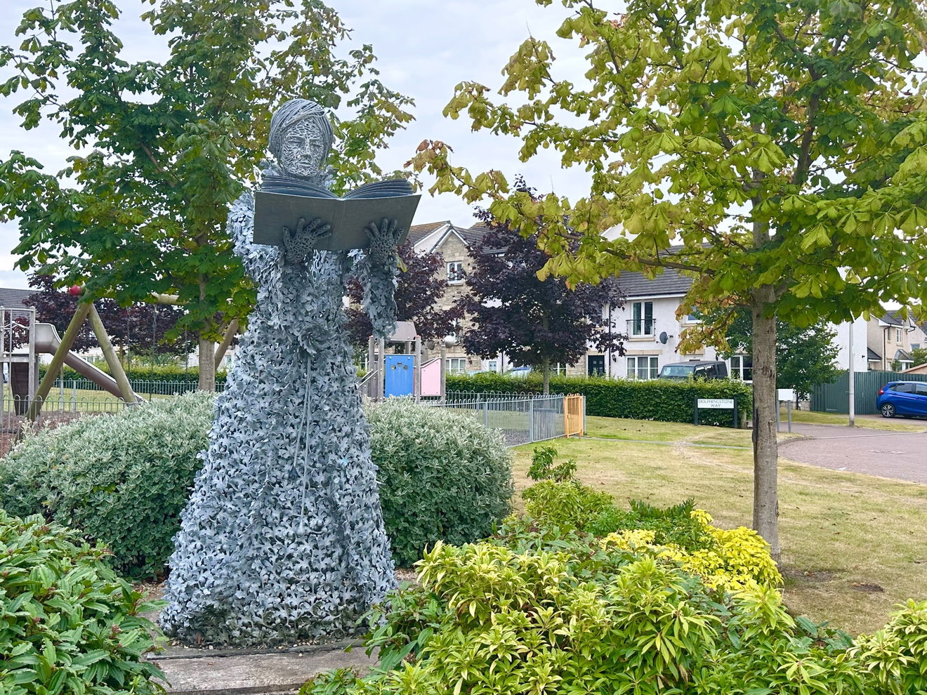 She's a spectacular sight and stands, reading her open book just in front of the children's playpark. She'll be passed by masses of people, walking dogs, returning from work, coming home with their shopping, closing curtains for the night.