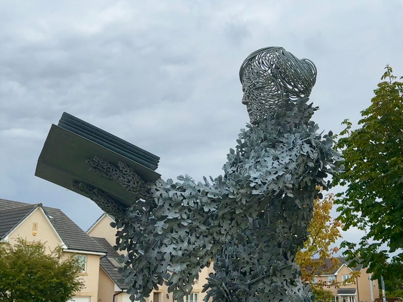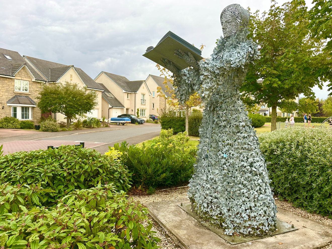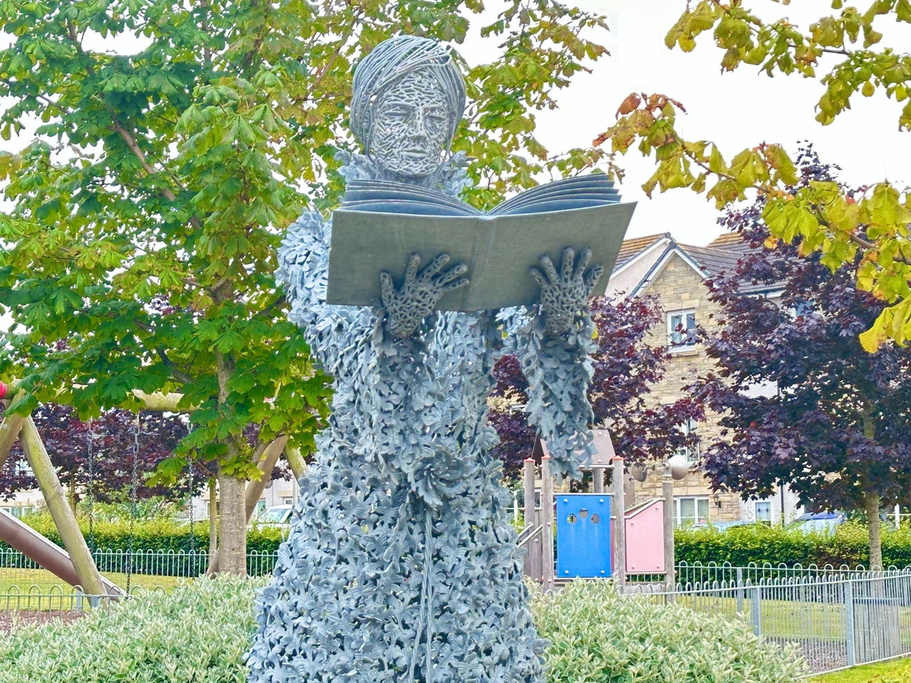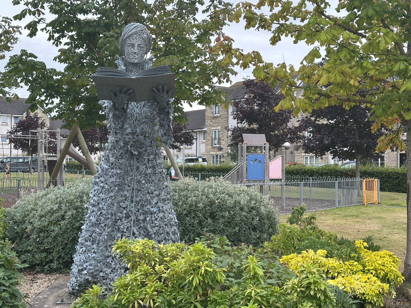 She's a spectacular sight and stands, reading her open book just in front of the children's playpark. She'll be passed by masses of people, walking dogs, returning from work, coming home with their shopping, closing curtains for the night.