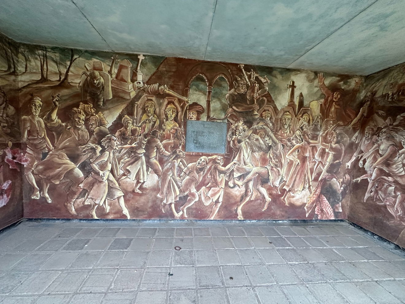This is a scene from a Robert Burns poem 'Tam O Shanter' showing witches and warlocks in a ruined church.