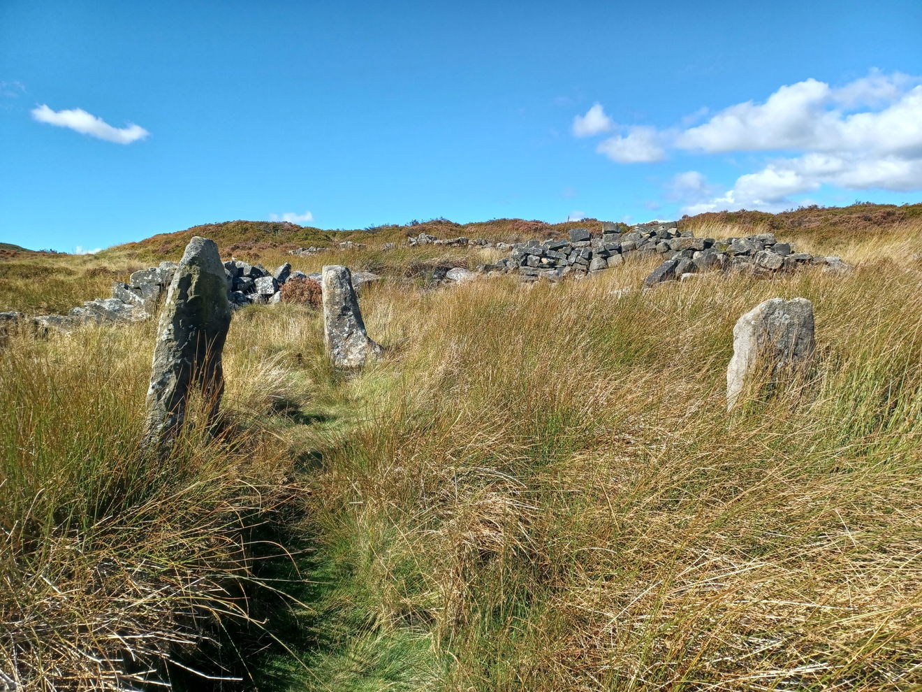 Despite being marked on maps and various apps, we struggled to find it at first as it was well hidden amongst long grass and blended into the remains of an old stone building or wall that had been built at a later date. We finally spotted three prominent standing stones slightly uphill from the path and realised we were in the right place.