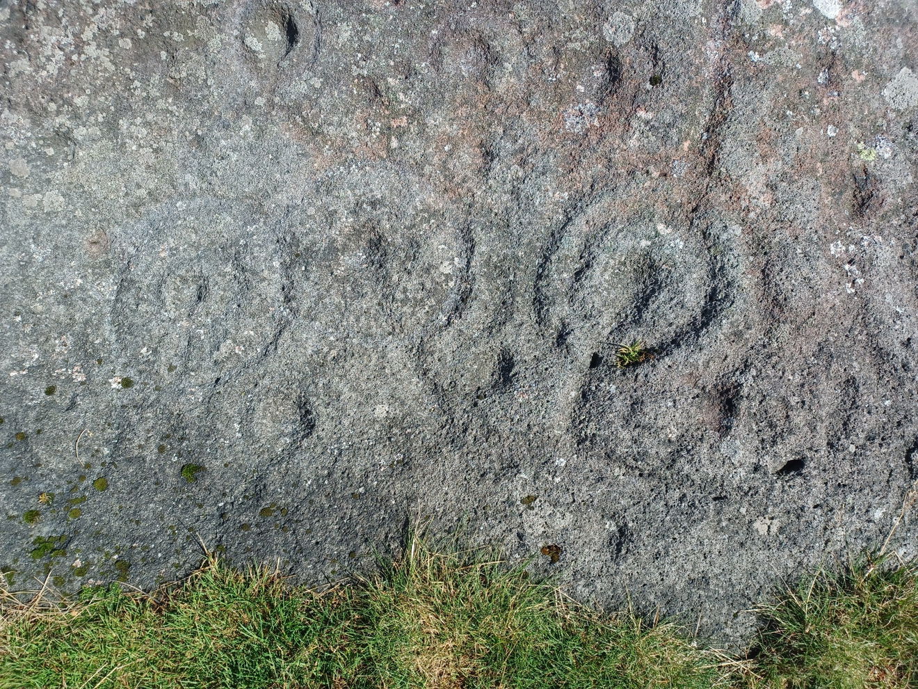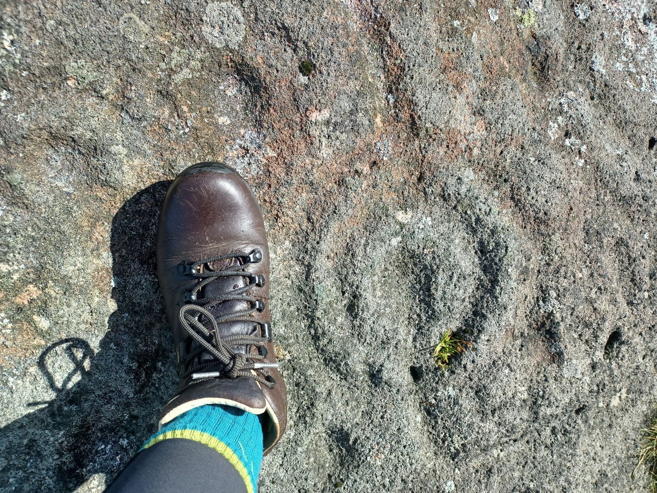 On first glance the marks appear to just be cups and rings, however, if you look more closely and get the right light on them, you'll see a much more intricate pattern with circles being linked up with 'grooves and gutters' and evidence of other unfinished symbols. All very curious! I've shared a picture of my boot next to one to give a sense of the scale of them - they are a lot bigger than I initially thought they would be.
