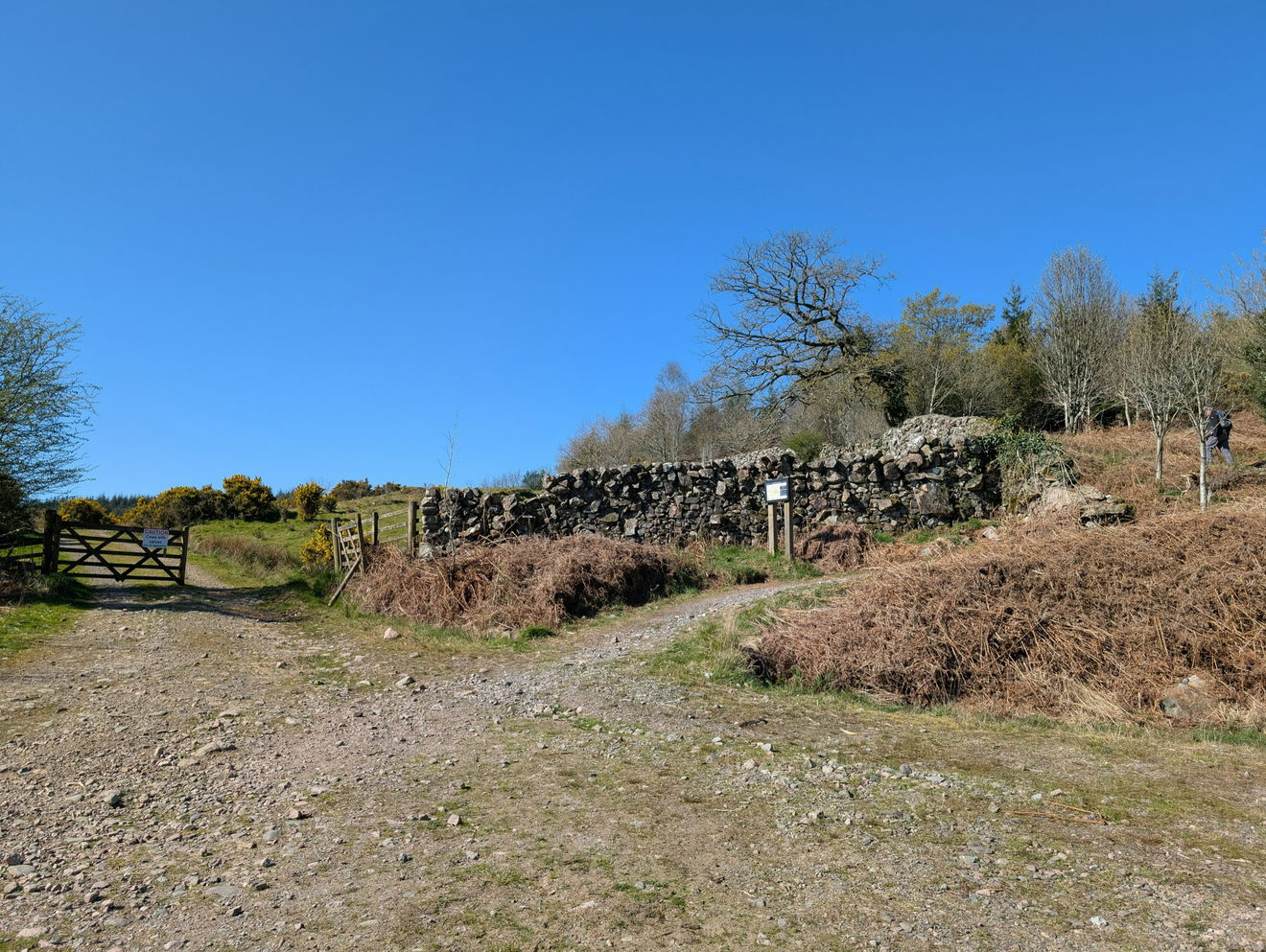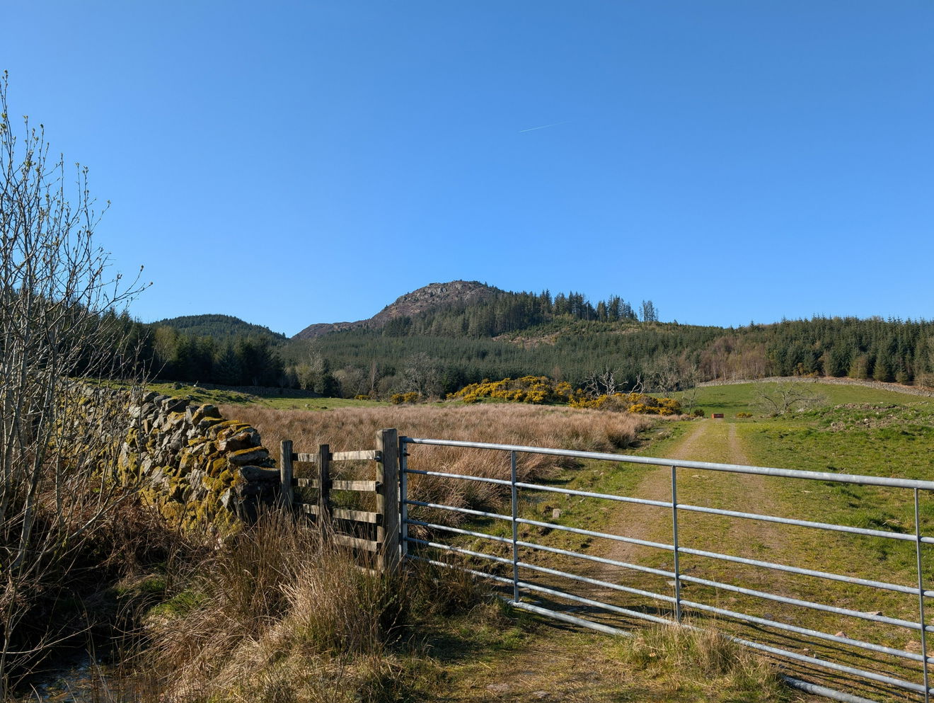 Go through a second gate at the top of the field. As you close the gate, you can see the south east end of Screel Hill in the distance behind you.