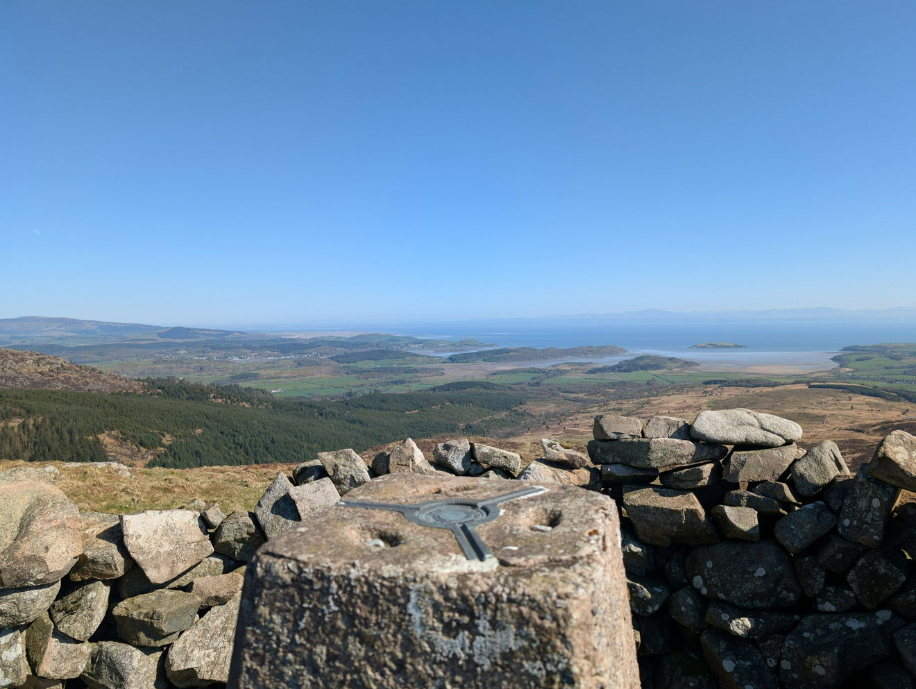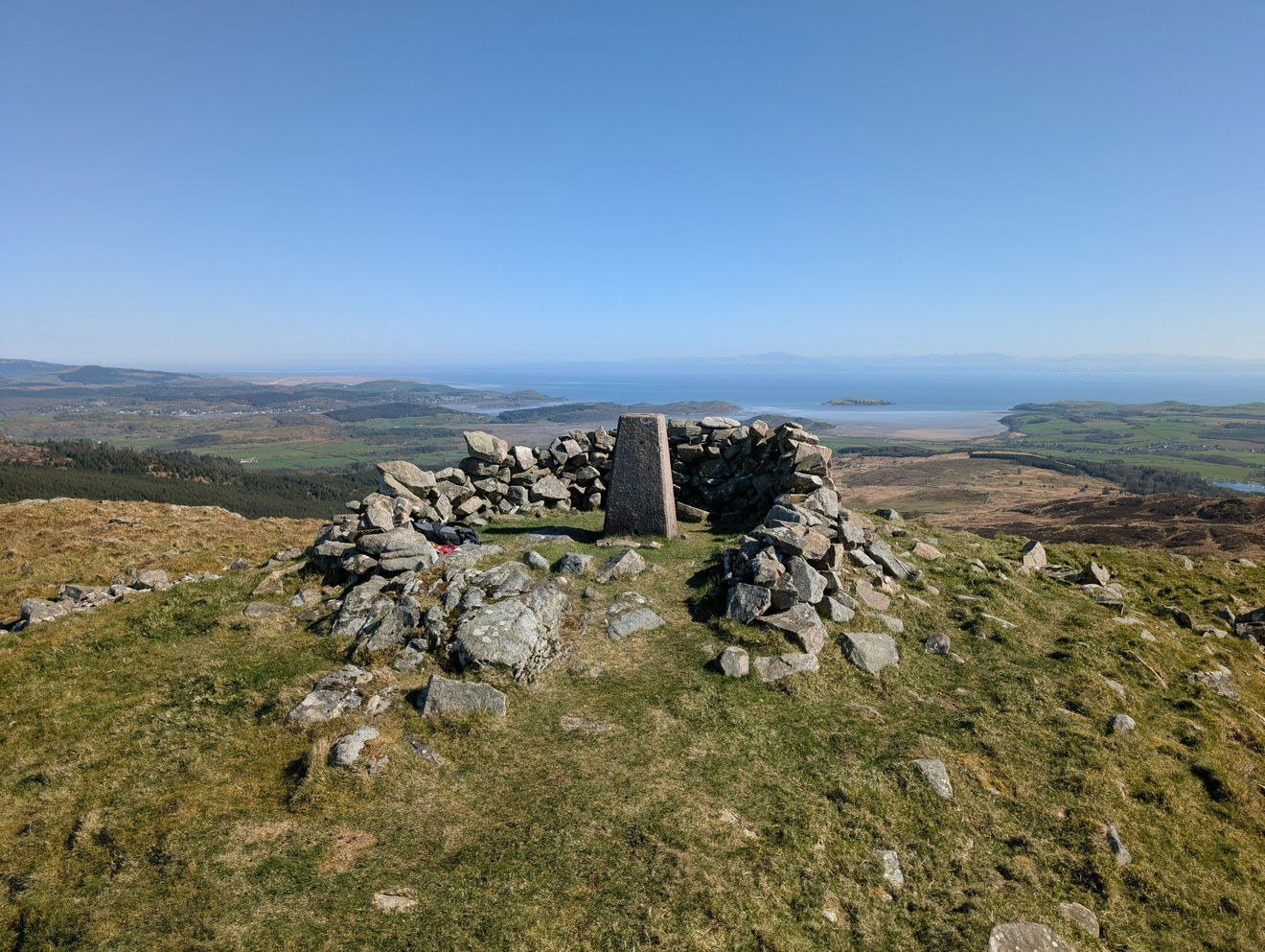 The Bengairn Trig Point sits on a hill (391m) near Dalbeattie with impressive coastal views.