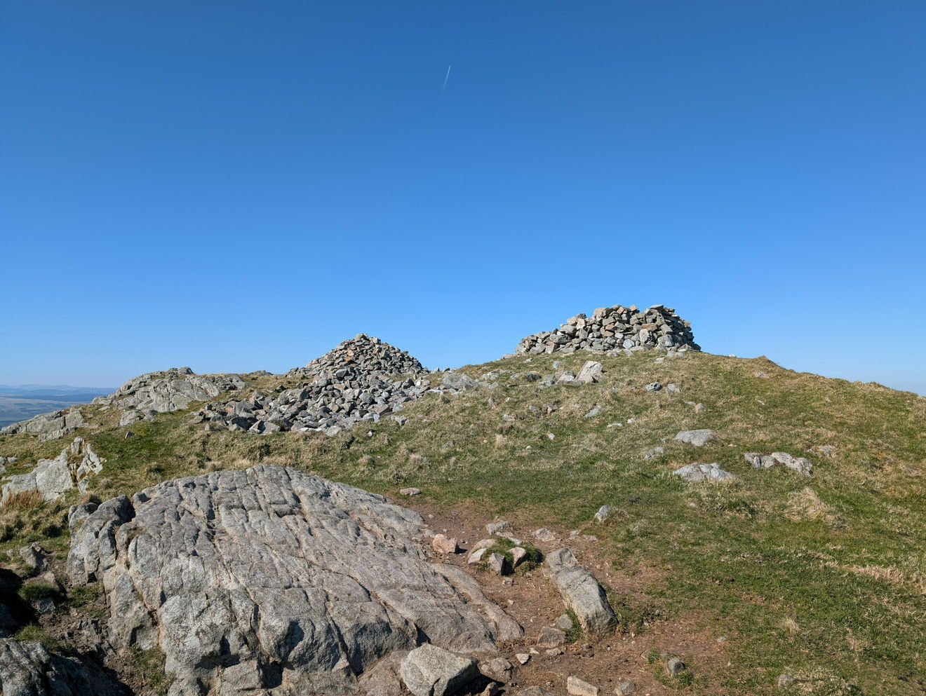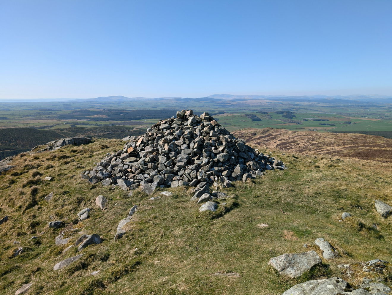 At the summit, you will be greeted with a large cairn and wind shelter containing the Bengairn trig point.