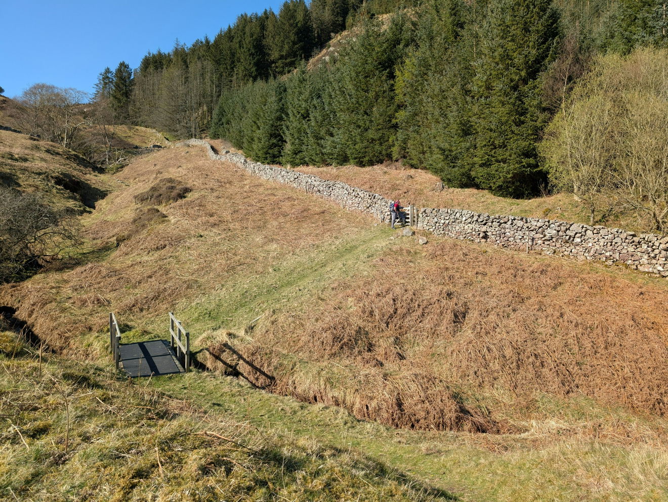 Go through the gate at the end of the track, go over the footbridge and follow the path as it turns right, heading up on your final ascent of Bengairn.