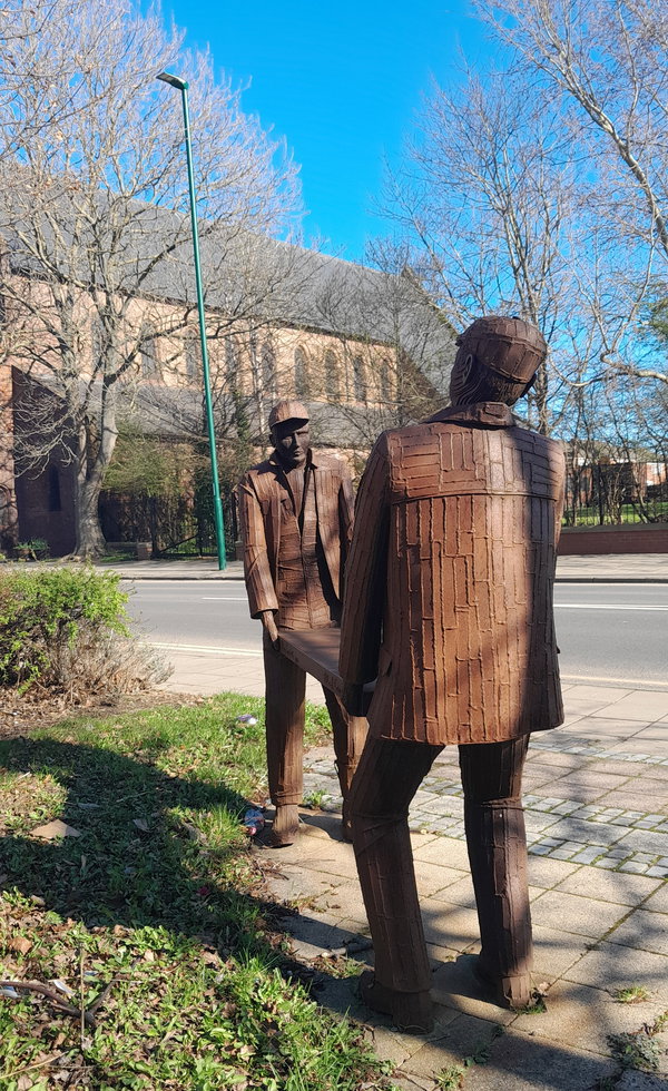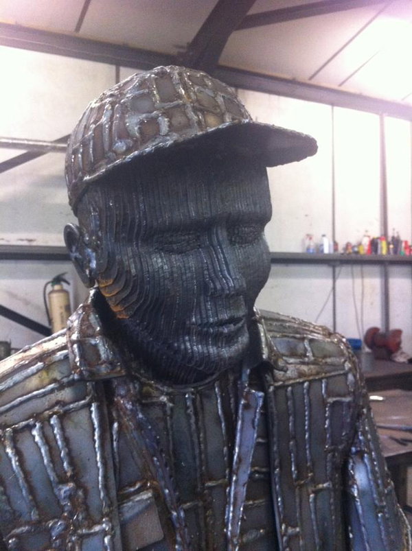 Ray's style involves using plated Corten steel and developing it into a three-dimensional composition. His signature is that you can clearly see the joins. The faces of these two figures are made of multiple strips of Corten steel, depicting the contours of the face.
