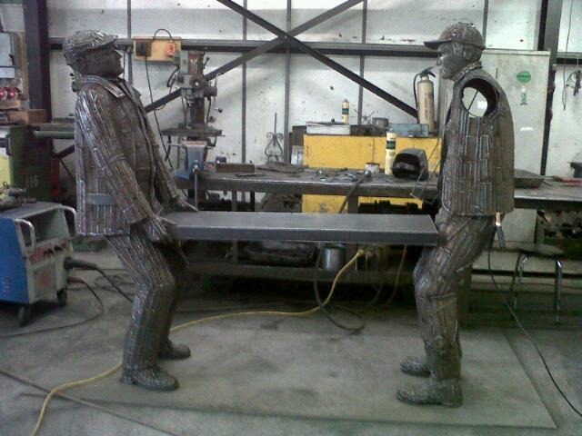 'Blank Canvas' was commissioned by Redcar and Cleveland council to depict the strength and resilience of the Southbank area in the face of almost losing its steel making heritage. The piece shows an old worker about to retire passing the steel baton (the lump of steel between the figures) to the first-year apprentice, who is the blank canvas for the future......The council were offered 3 options by me. 1 was a huge abstract germinating pod which was considered a little too weird. Another was a larger than life female figure bursting from the ground and suspended 6 metres by a number of steel poles. This was apparently a close runner up. The chosen option was regarded as the most suitable for the area by the panel.