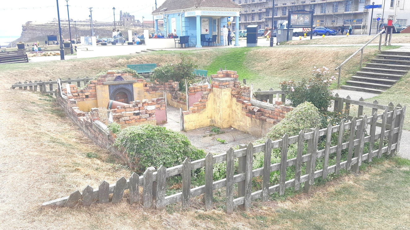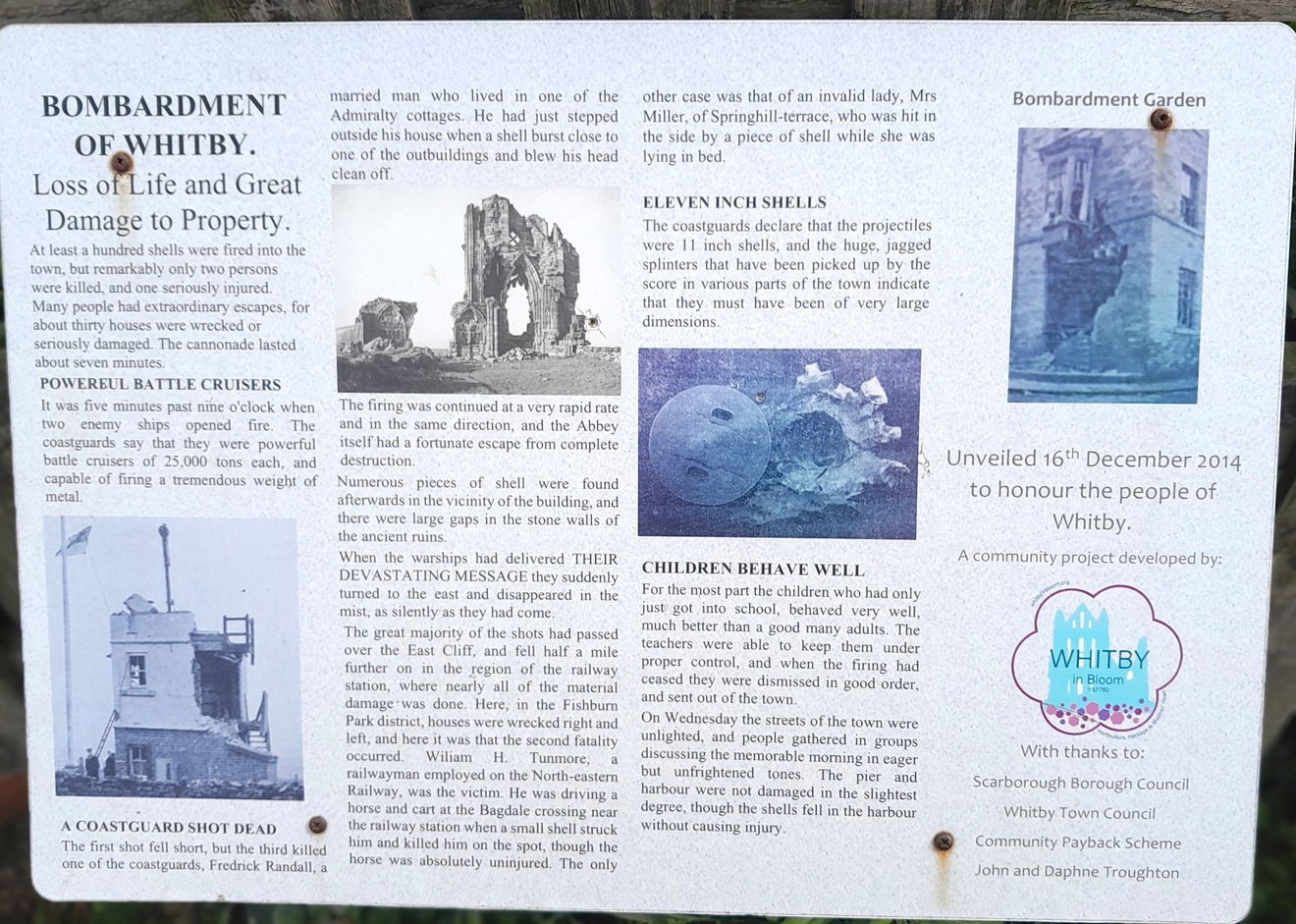 When I saw on the map there was a memorial garden on Whitby's West Cliff, I certainly didn't expect to see this clever interpretation, which is to remember the coastal attack of 1914. What was extraordinary was that this was the first time in a war in this country that civilians were attacked. Two German cruisers fired shells at Scarborough, Whitby, and Hartlepool. They caused much structural damage and two people died in Whitby. It could have been a lot worse.