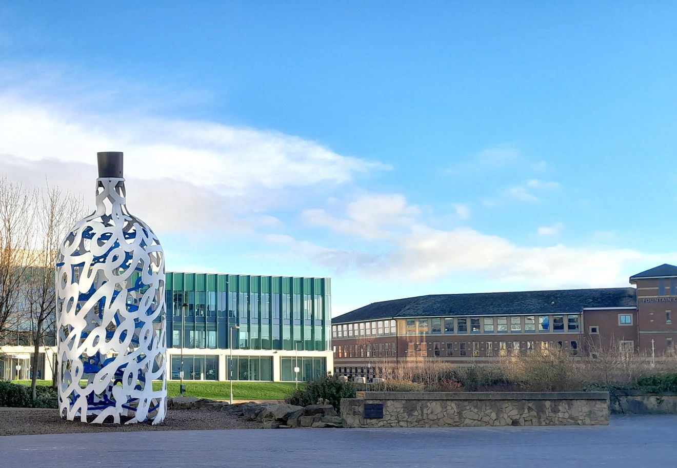The swirly steel construction, which gives the bottle its shape, depicts the writing taken from Captain James Cook's journals, and the internal blue steel is a poem.