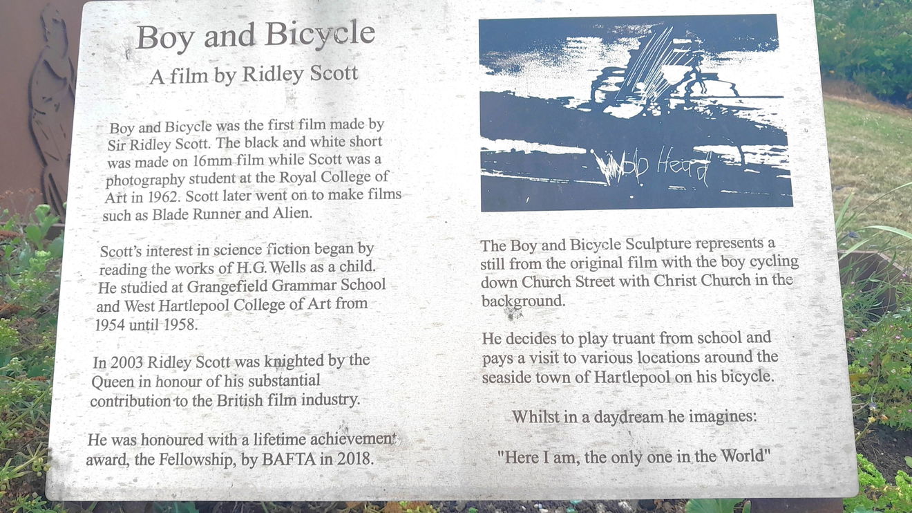 In a quiet corner of the Transport Interchange car park, Lynn Street, off Church Street in Hartlepool, there's a life-size metal installation. Boy and Bicycle is a tribute to the directors Ridley Scott (born 1937) and Tony Scott (1944 to 2012)