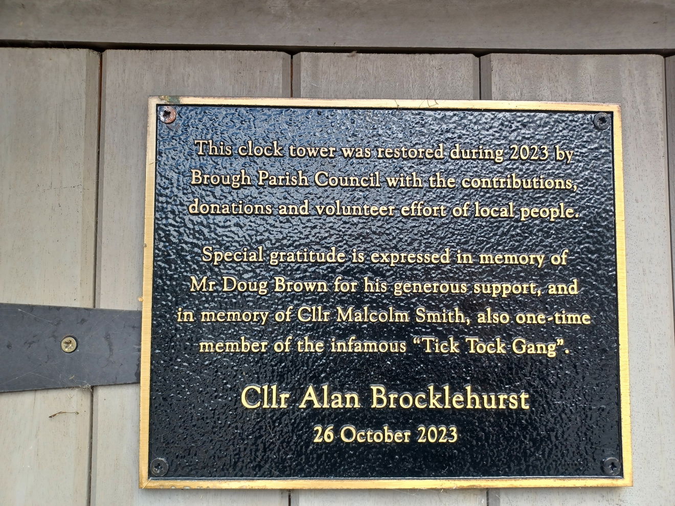 Another reads: This clock tower was restored during 2023 by Brough Parish Council with the contributions, donations and volunteer effort of local people. Special gratitude is expressed in memory of Mr Doug Brown for his generous support, and in memory of Cllr Malcolm Smith, also one-time member of the infamous 'Tick Tock Gang'. Cllr Alan Brocklehurst 26 October 2023. Now this one piqued my interest a bit more... Tick Tock Gang? Surely not the popular social media platform? I can't find anything to the contrary but I will have to assume it refers to the sound a clock makes.