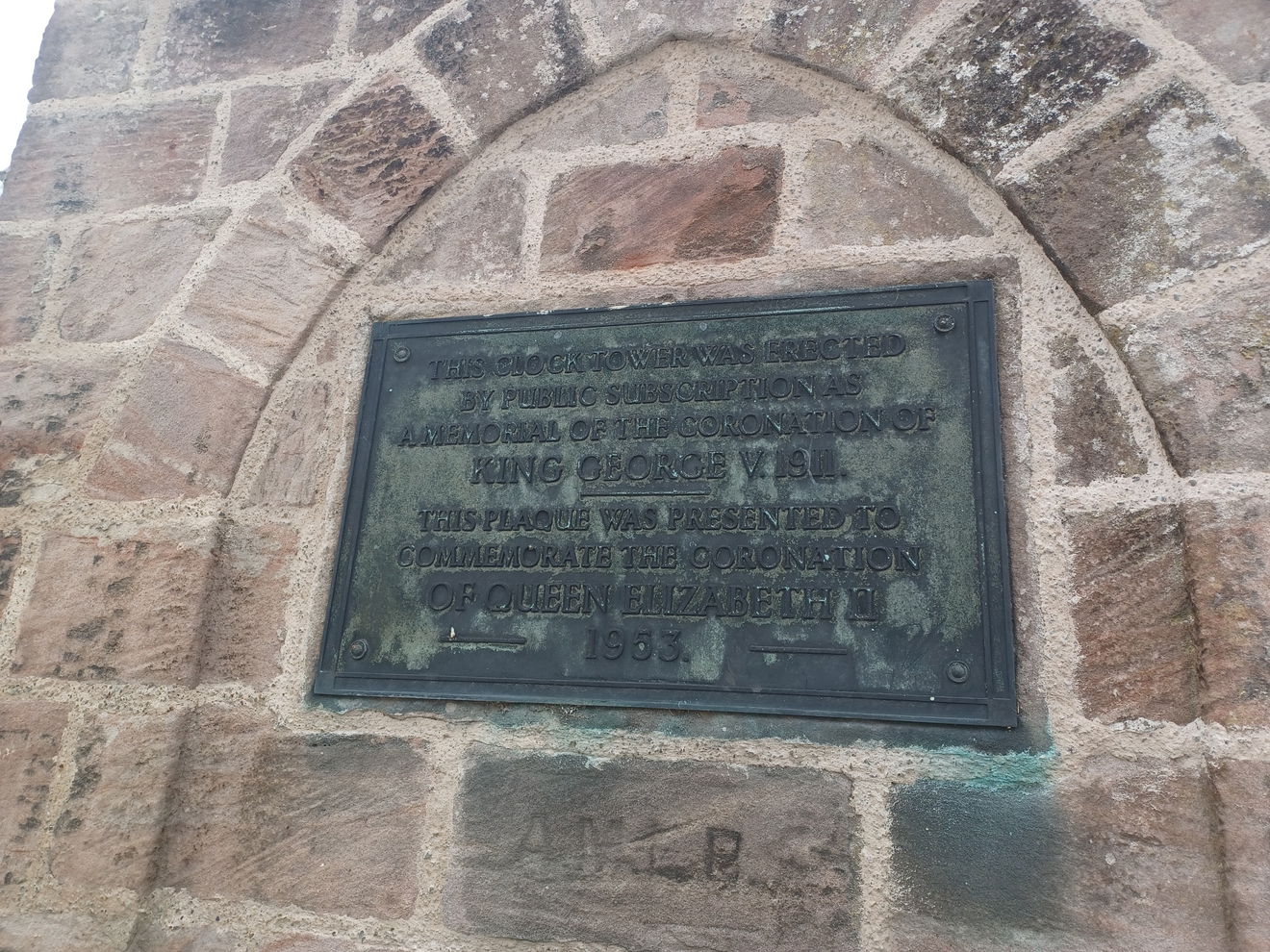 The clock tower has a number of plaques on it; the original plaque reads: This clock tower was erected by public conscription as a memorial of the Coronation of King George V 1911. This plaque was presented to commemorate the coronation of Queen Elizabeth II, 1953.