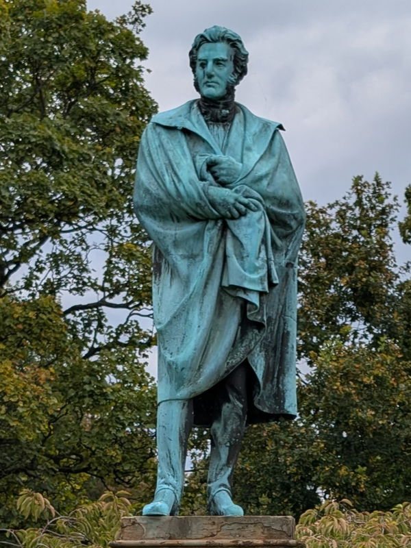 The life size bronze statue of Onesiphorns Tyndall-Bruce was designed by John Steell and sits on top of a plinth that was built by David Bryce in 1864.