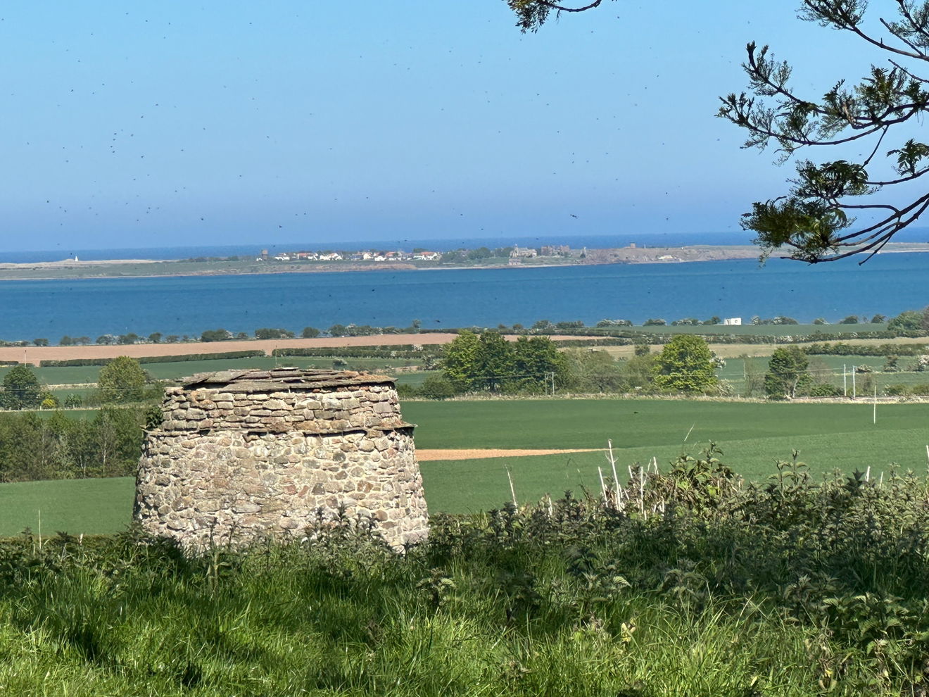 It sits on a slight slope in a field, under the shaded boughs of a grand old horse chestnut with enviable views to Holy Island and beyond.