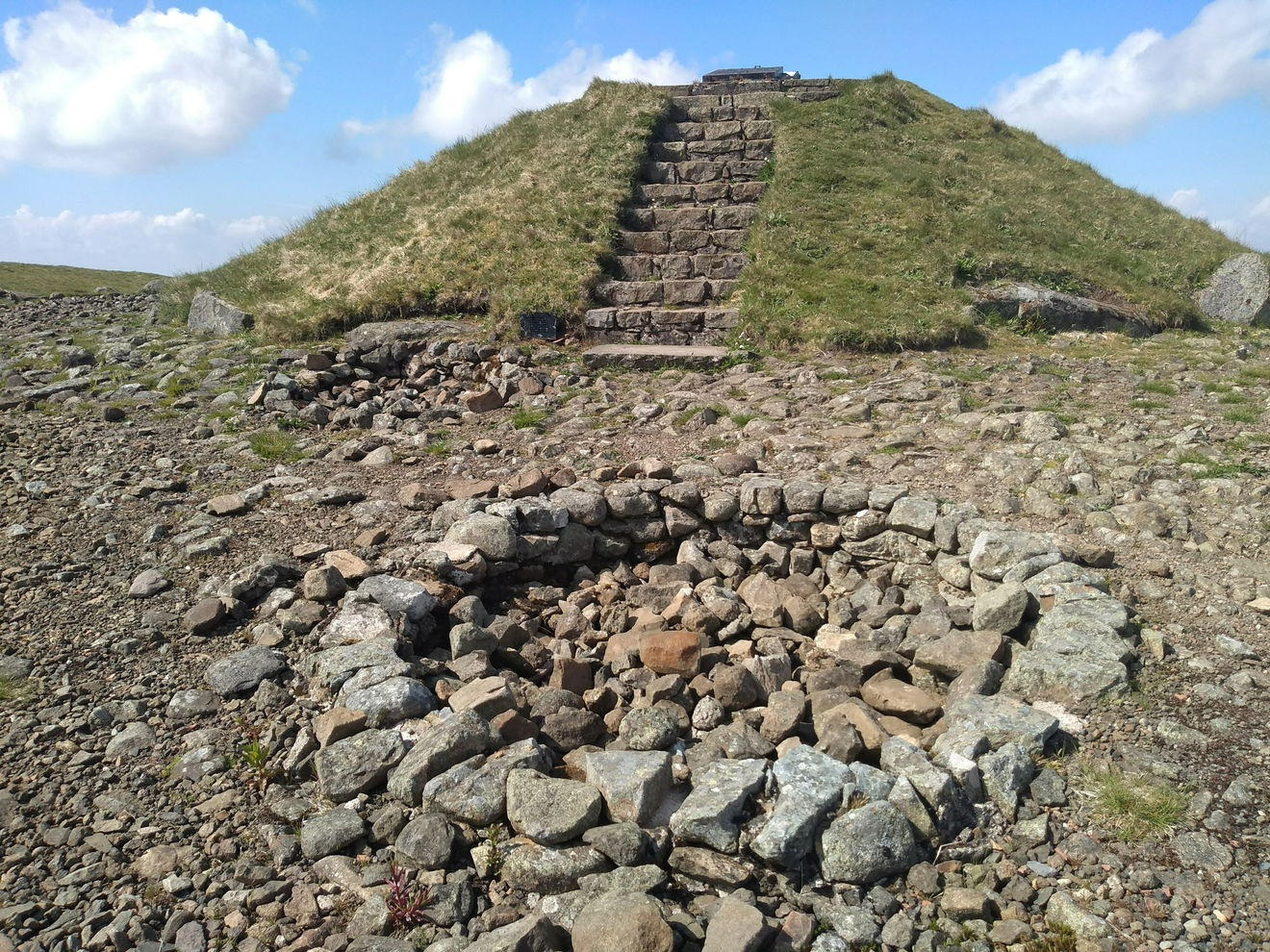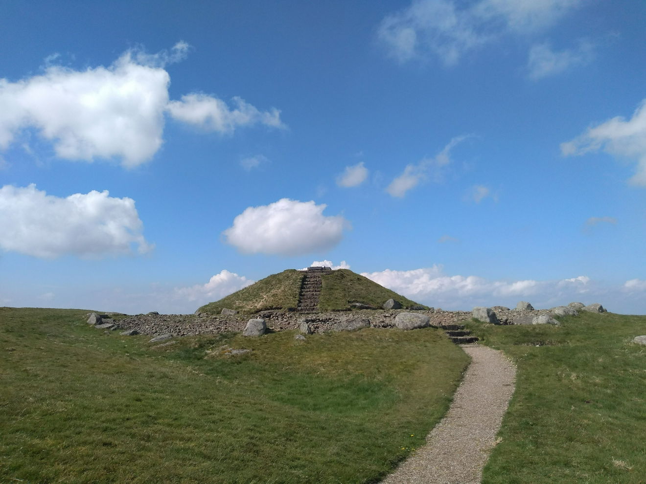 Under the cairn, there were found to be traces of at least one burial, with wooden objects and pottery which has been dated to around 2000 BC. This cairn was later covered by a second much larger cairn of around about 15m in diameter and several metres high. It had a kerb of large stone slabs which incorporated the Bronze Age burial cists (stone coffins).