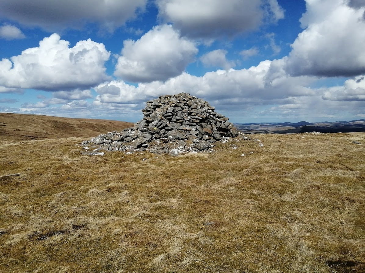 These are usually just a surround of scattered stones, probably made over time by hikers carrying stone up the hill. Let me show you what I mean with a picture of the cairn on the top of Windy Gyle.