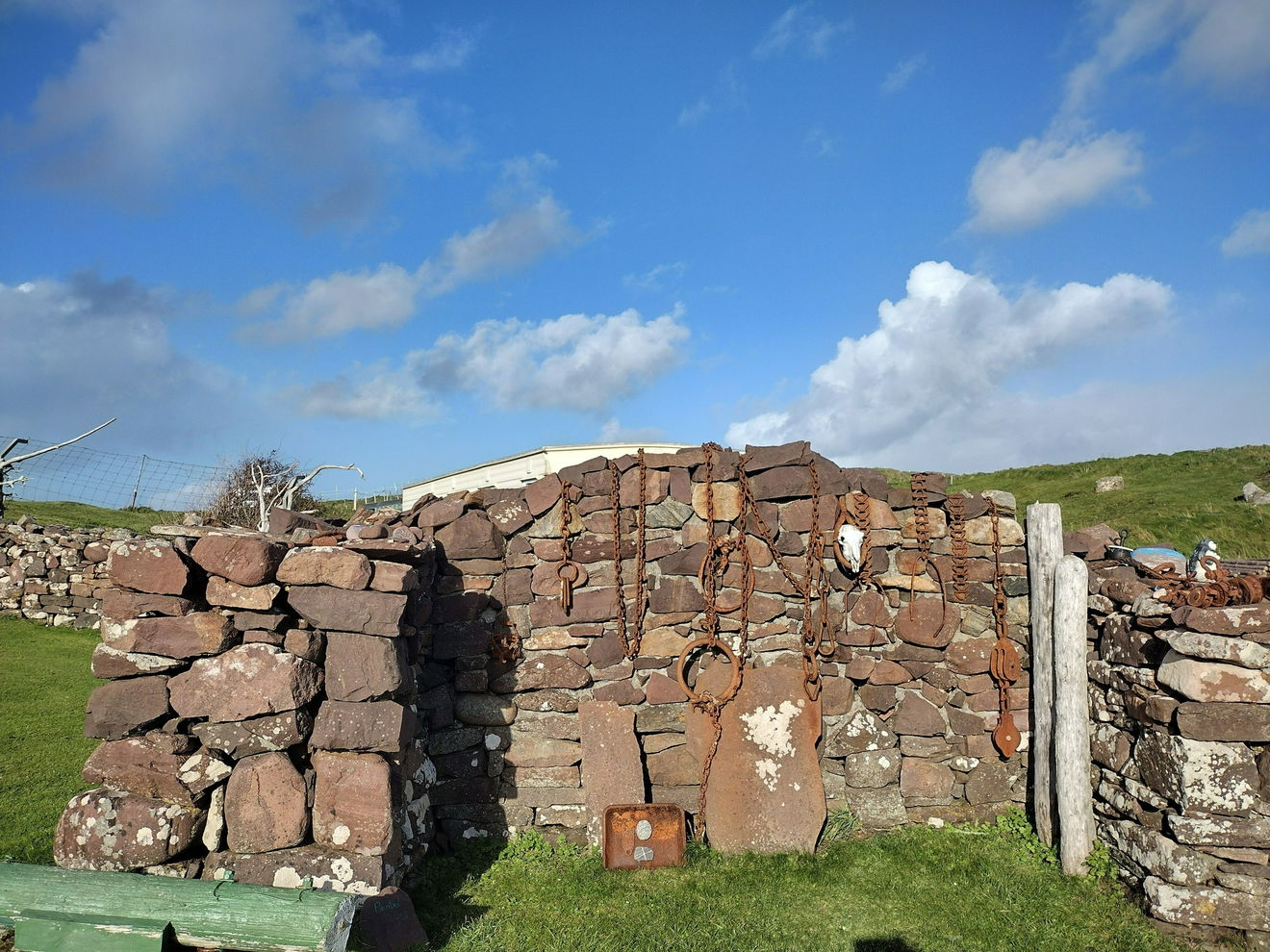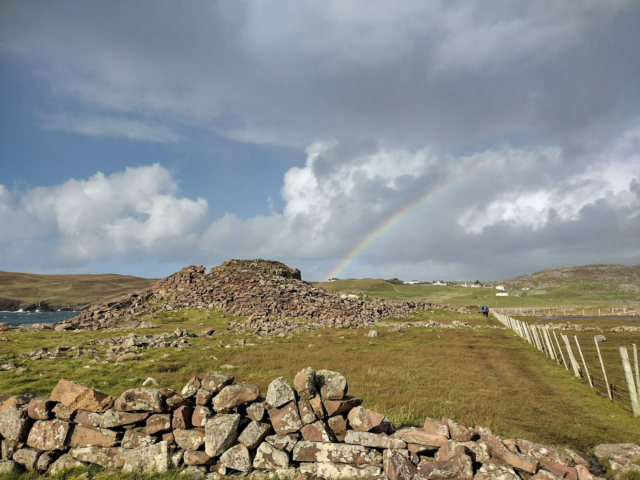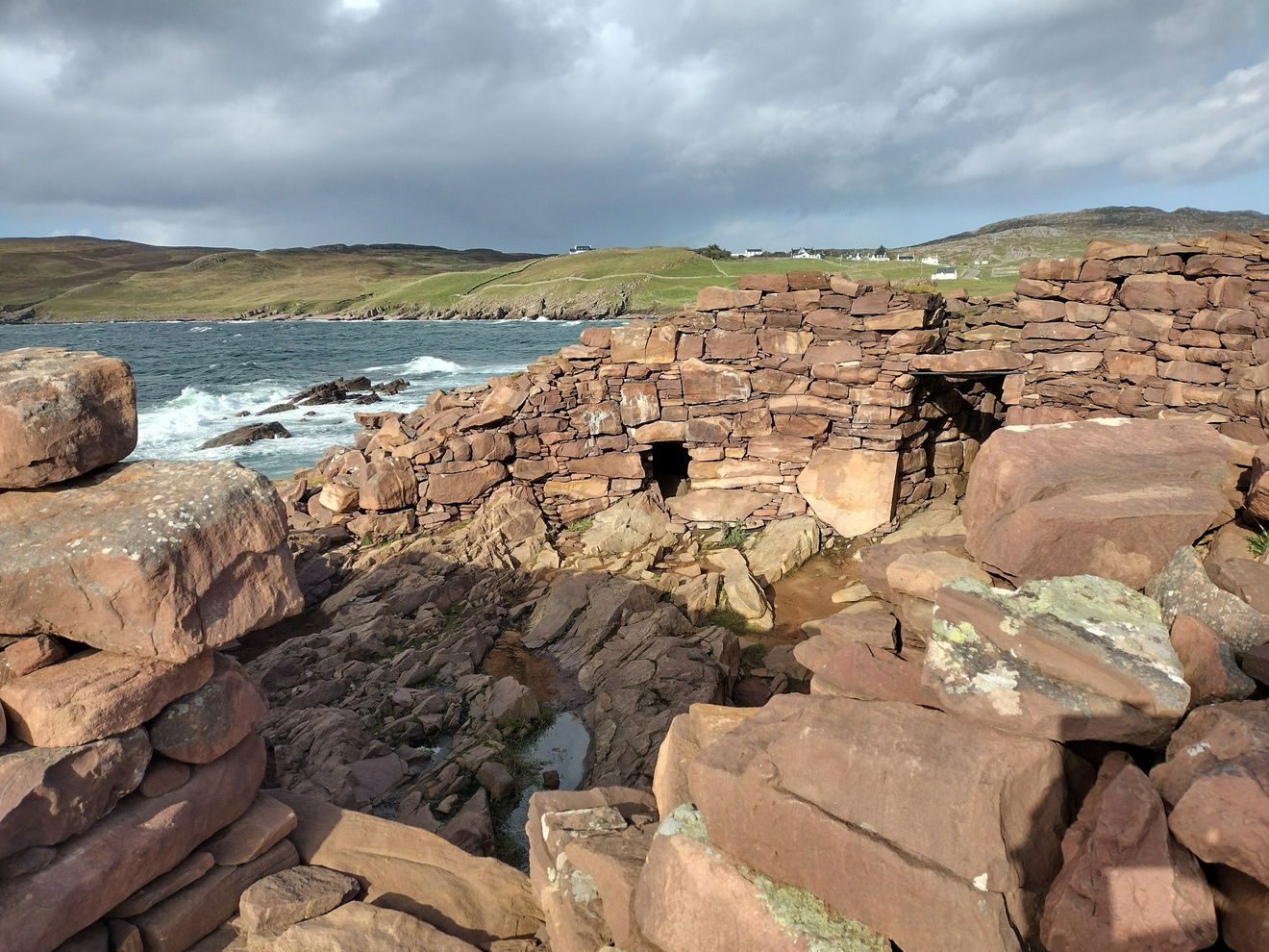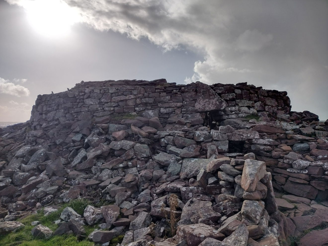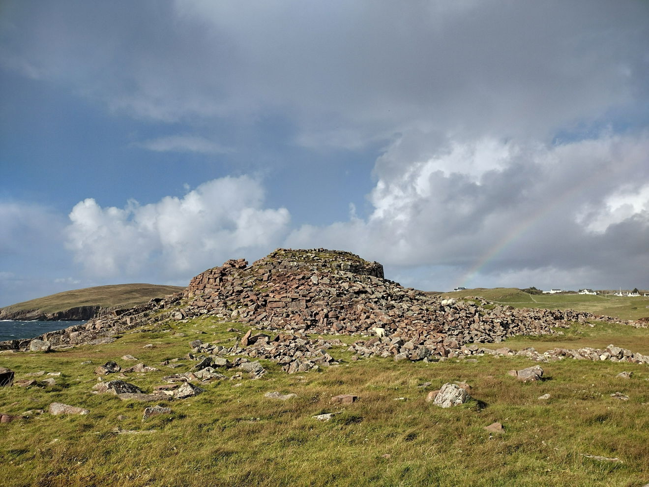 Continue along the coastal path as it passes through a field in front of a house, then heads up a grassy bank. Stay on the path and watch out for what looks like a huge pile of stones, this is the broch and its entrance is on the opposite side.