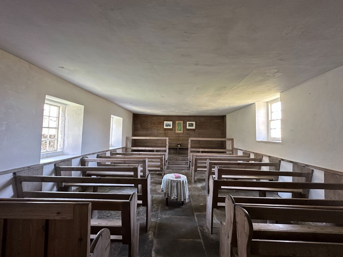 Inside, it felt like a relic from Little House on the Prairie. It was more like a schoolroom than a place of prayer. Lime wood pews lined the room and stood on a plain flagstone floor.