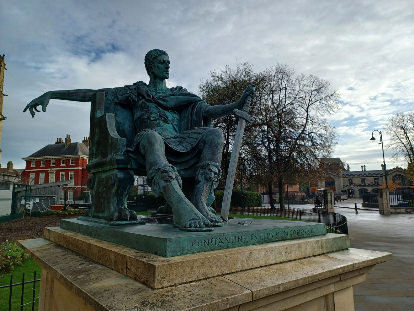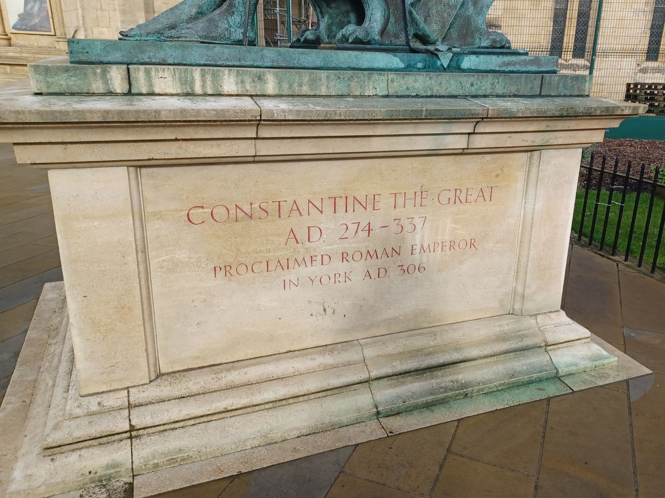 On a recent trip to York I wandered past the minster and stumbled on a roman column and a statue to Constantine the Great. York has a plethora of history, however, the Roman era is slightly dominated by the 13th century minster, the medieval city walls and links to the vikings. The Roman era was just as significant and the proclamation of Constantine as Roman Emperor in 306 marked a massive turning point in Roman history. The bronze statue was created in 1998 by sculptor Philip Jackson who was also Royal Sculptor to Queen Elizabeth II. It depicts Constantine in military clothing, looking thoughtful and holding a broken sword which forms a cross, marking the end of his military campaigns and the embracing of Christianity in the western world.