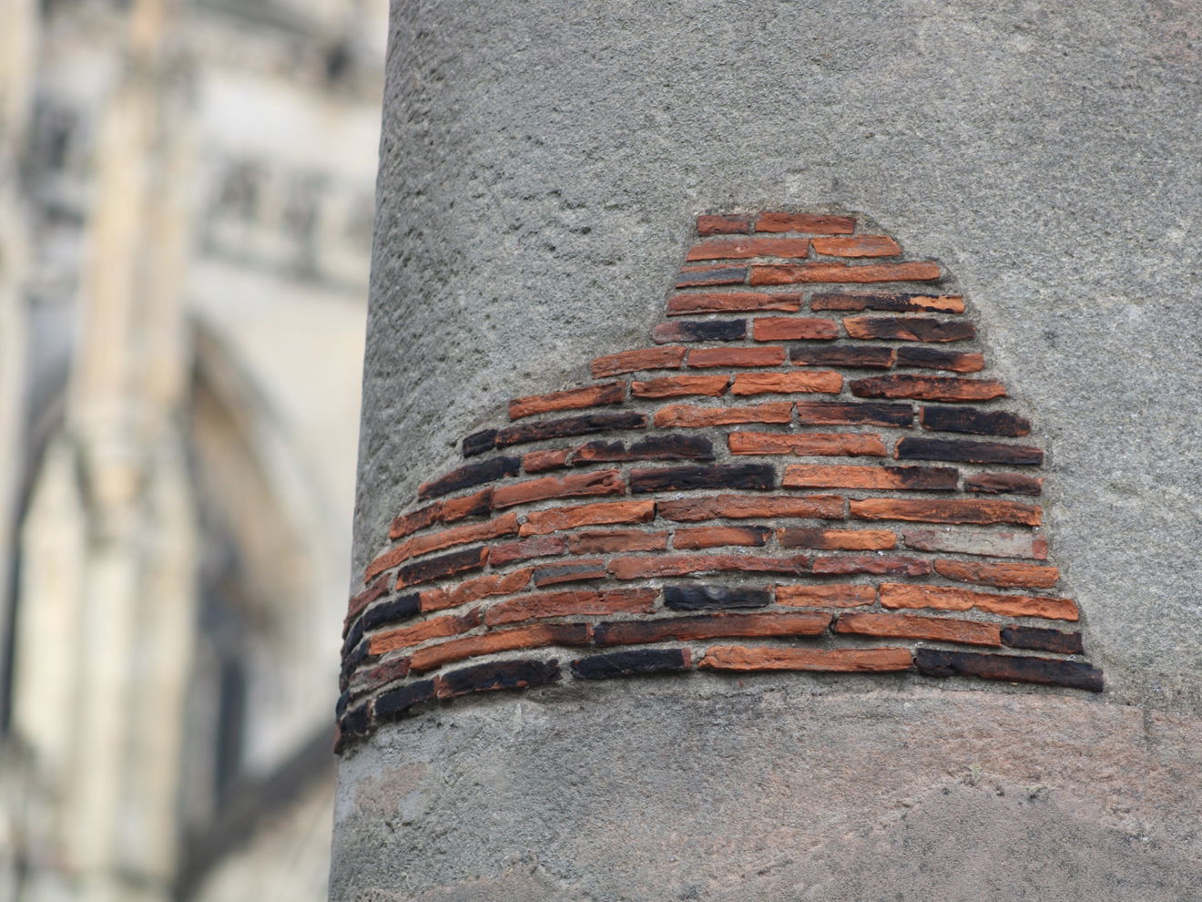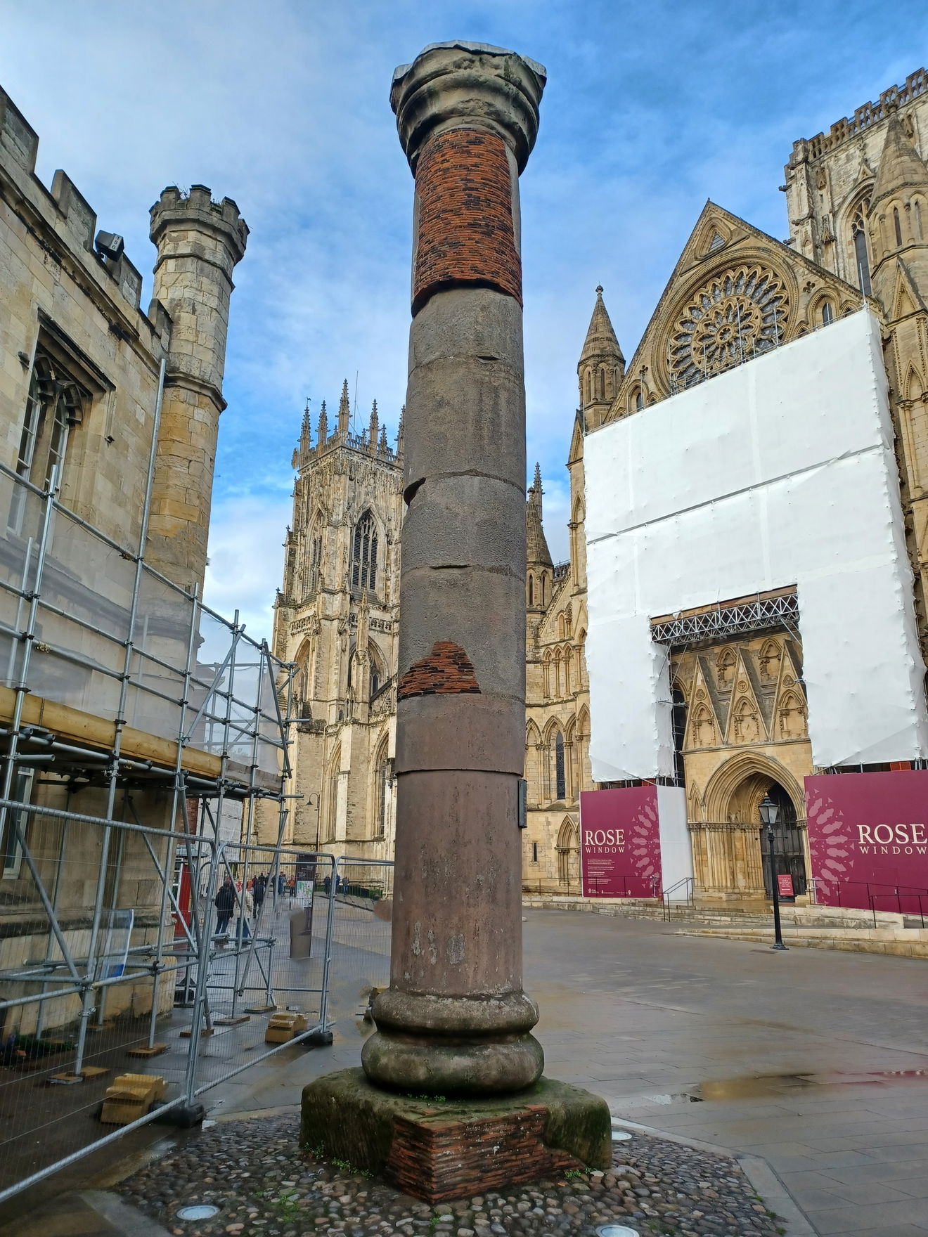 York Minster was built on top of the barracks of the fort of Eboracum in 1220, and so there is likely a lot of preserved remains under the cathedral. When work took place on the foundations of the minster in the late 1960s, they discovered the military headquarters, and you can see these remains today in the undercroft in the minster alongside some artifacts that were found there. During the work, they also discovered a column from the fortress lying on it's side, which was removed and put in place in the minster yard close to the statue of Constantine. There is a plaque on the column which states it was erected on the site to mark the 1900th anniversary of the founding of the city, and was relocated to the yard in 1971.