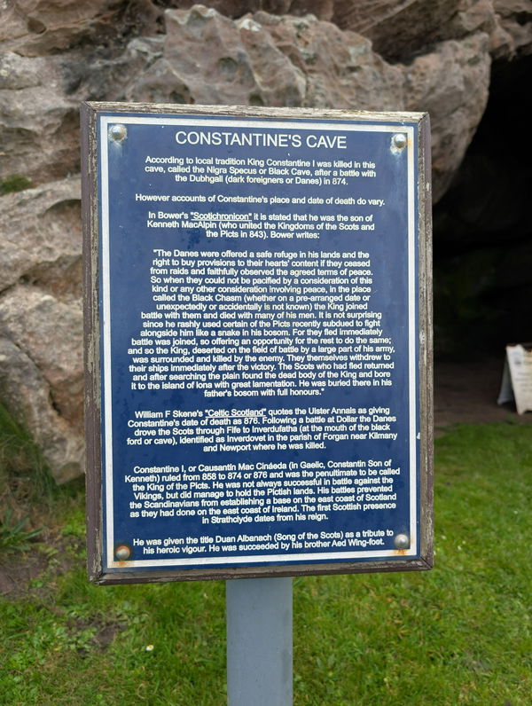 There are conflicting recordings of where Constantine was killed, some records have his death at Inverdovat near Newport-on-Tay, whilst others have his death here. Nevertheless, the cave is still a shrine to his life and those of the other Picts that died defending their land and people against the Viking raiders.