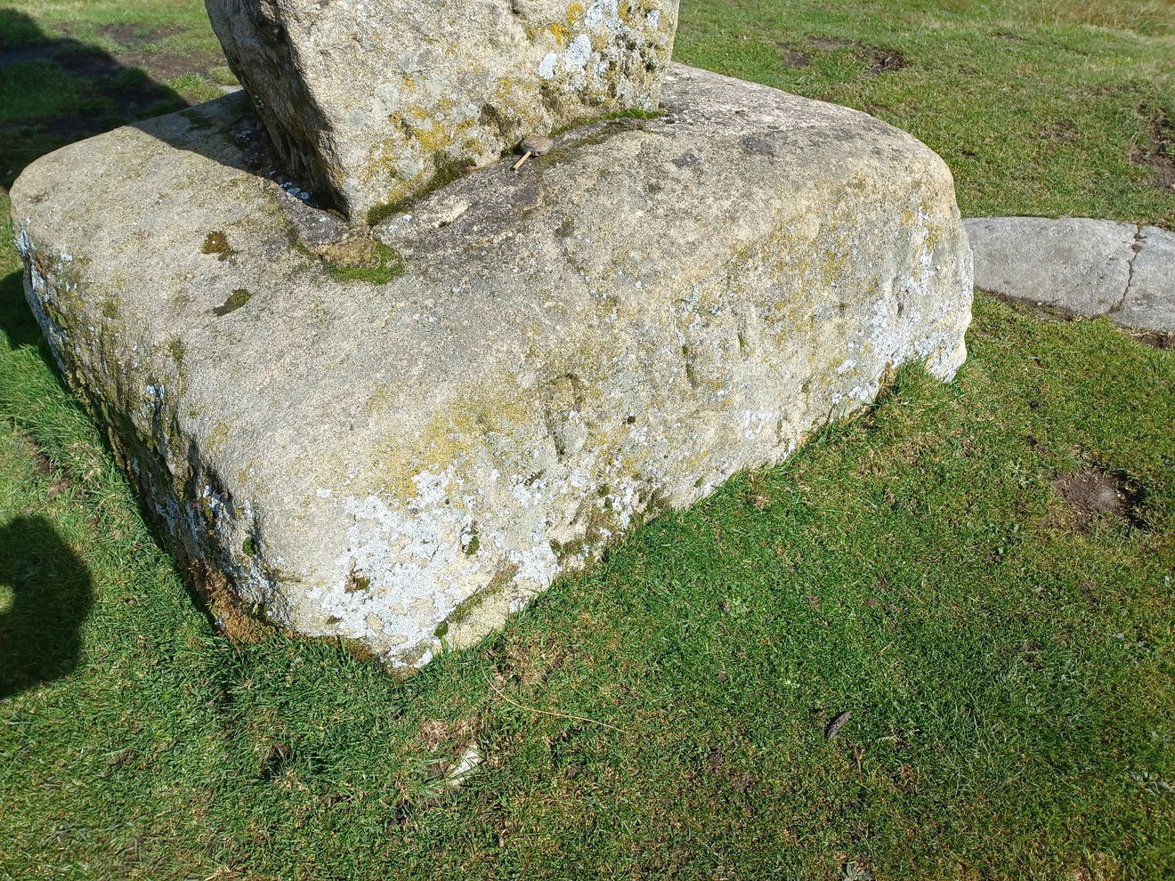 It is originally thought to date back to the 12th century, however, only the base is original now. It has had some bad fortune over the years and the stone was struck by lightning and split in two at some point. The upright shaft was replaced with a re-worked gatepost in the 19th century, and in more recent years it was vandalised and four cup and ring marks destroyed, so the cross is unfortunately a bit of a 'Trigger's Broom'.