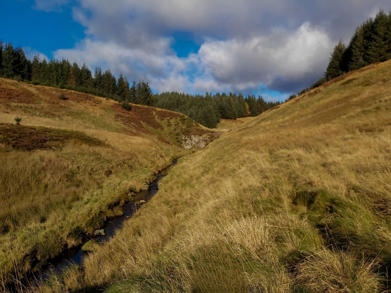 Right where the river splits at the Usway Burn and Clay Burn, the map wanted to take me north east and away from the burn. There also seemed a path directly north, but that would take me into the forest. Instead I follow a faint track through the grass and bracken that hugs the Usway Burn.