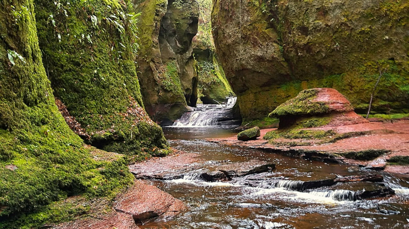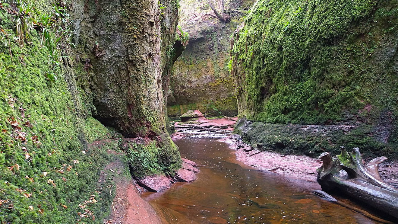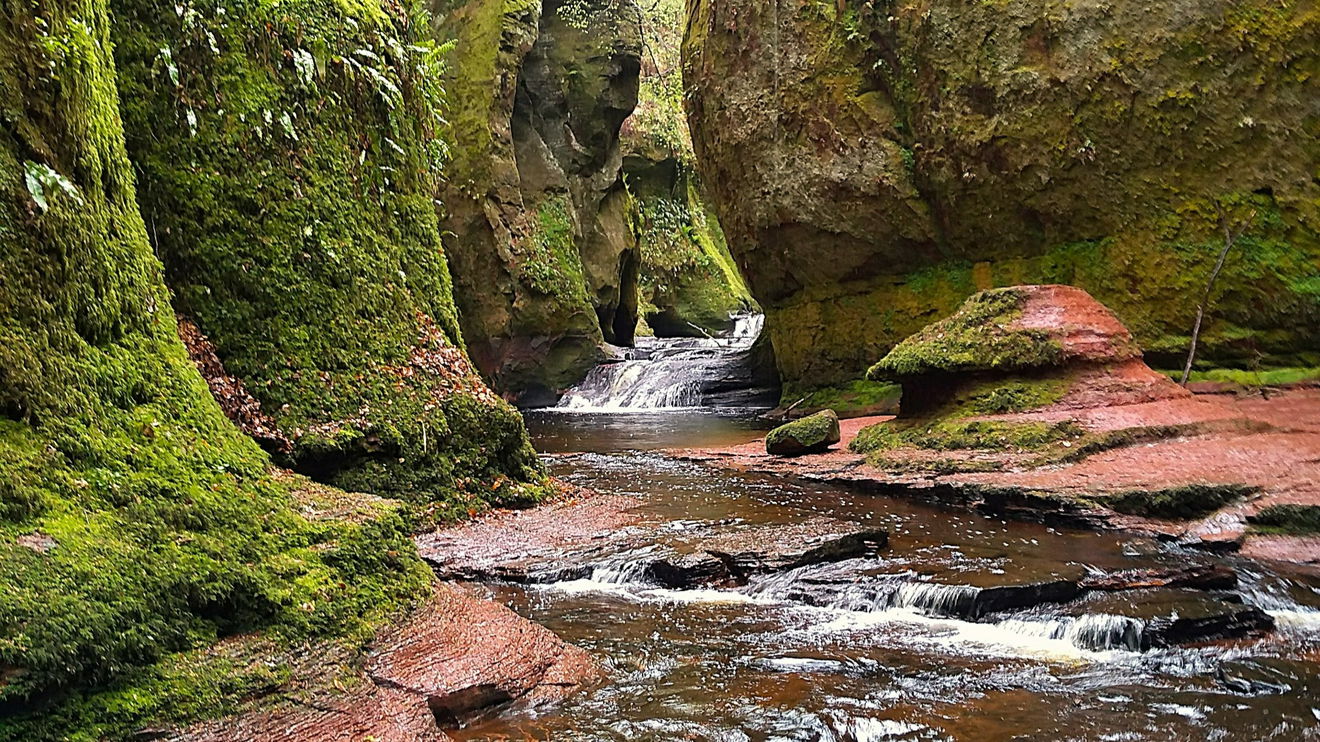 The Devil's Pulpit is is hidden in a gorge within Finnich Glen. The name is derived from the weird almost mushroom shaped rock formation that sits in the gorge. The red sandstone through which the waters flow, gives the water a distinctive red hue. which contrasts with the green of the moss makes it both stunning and eerie at the same time.