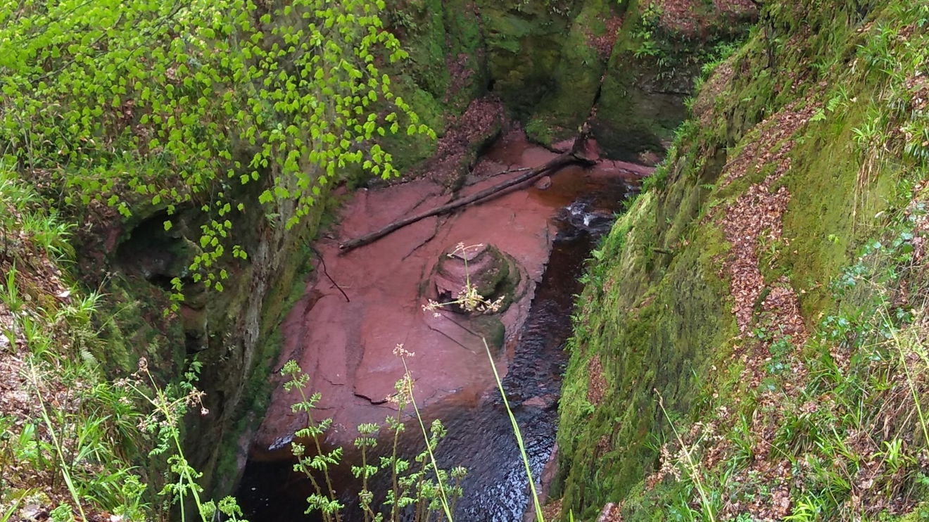 The sandstone gorge, which is over 20m deep in places, is carved by the Carnock Burn. The Devil's Pulpit is the result of the erosion caused by the flow of the burn over and around the sandstone over millions of years.