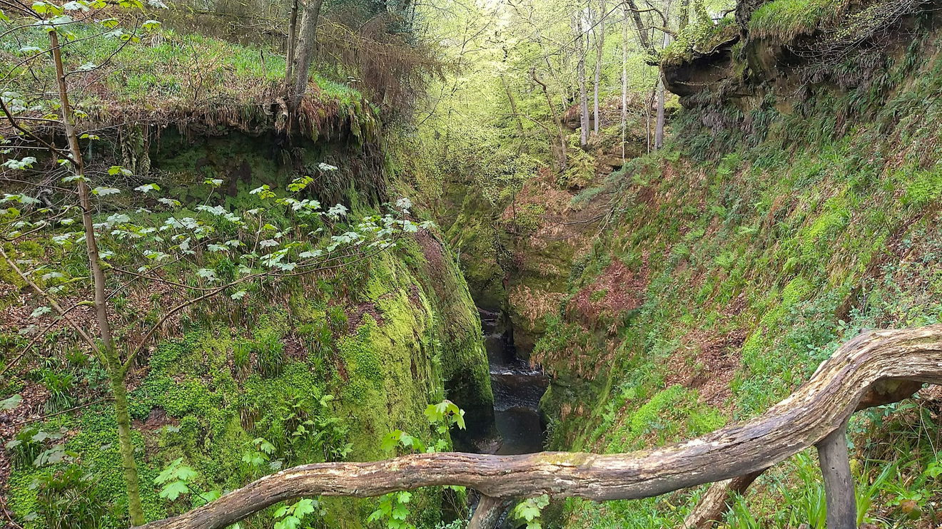 From the parking area, head south over the bridge and take the path on the left into the woodland. You are able to see the gorge from above from the path through the woods. Follow the path a little further and you will find the step down to the Devil's Pulpit on the left.