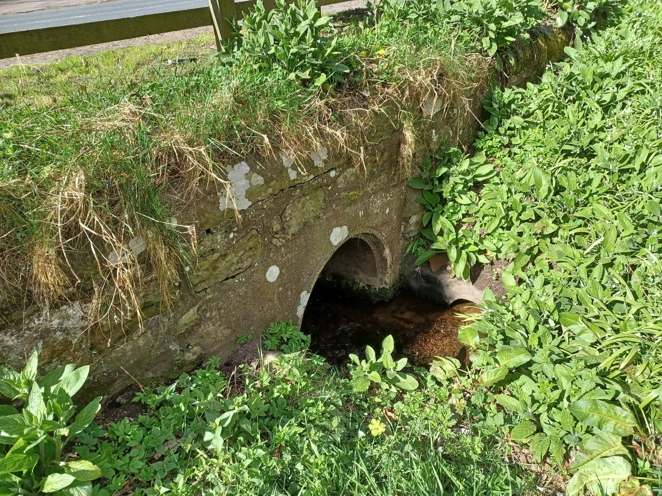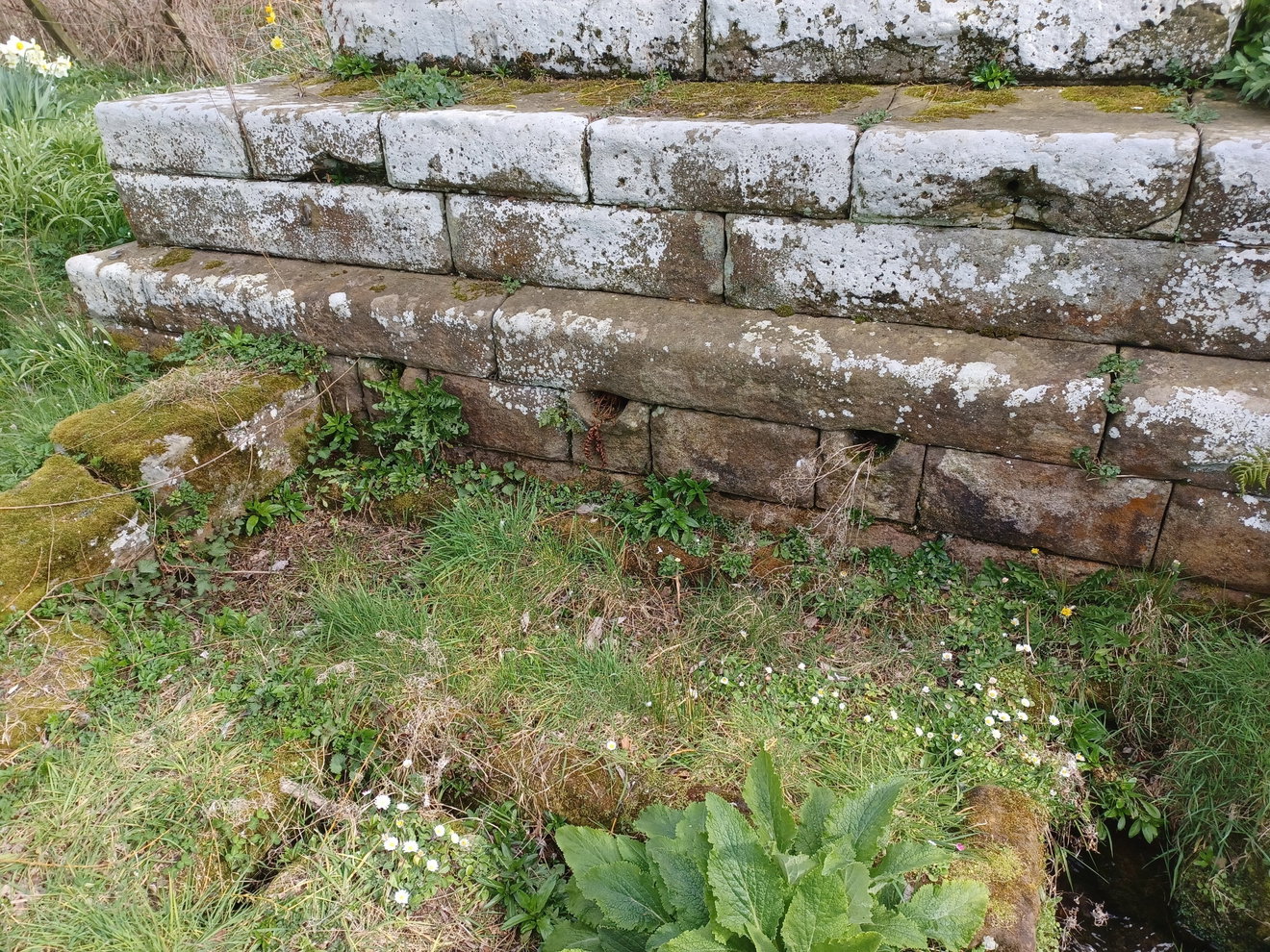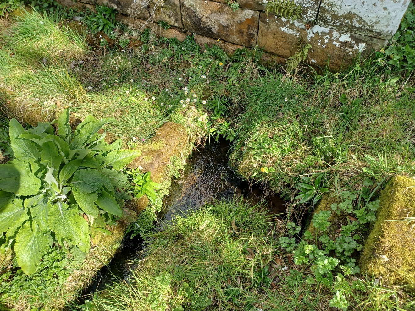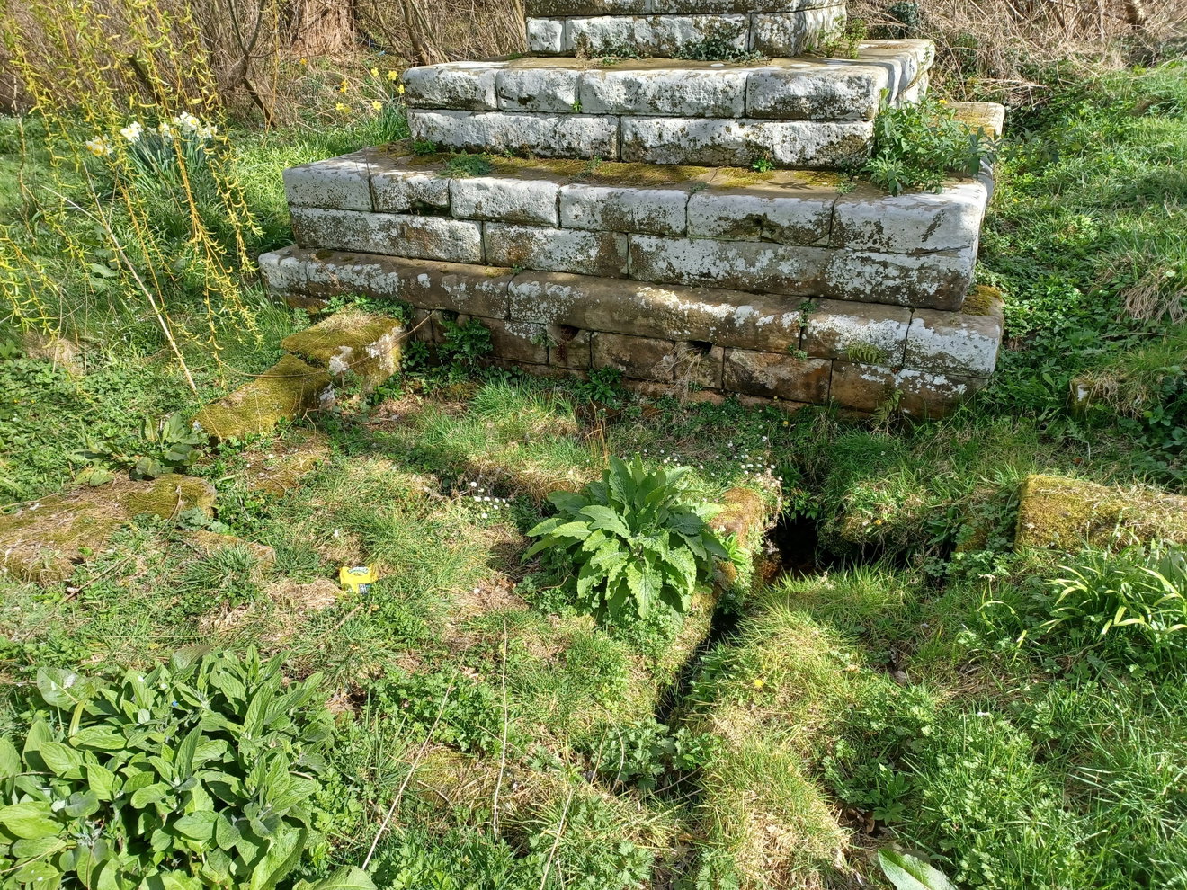 The water would have come out from the three small holes at the base of the steps and this fed into a curved stone channel that led down to the main basin where the water would collect before draining away to a nearby culvert. This is almost visible underneath the grass that has overgrown it. Hopefully there will be an opportunity to unveil the original soon.