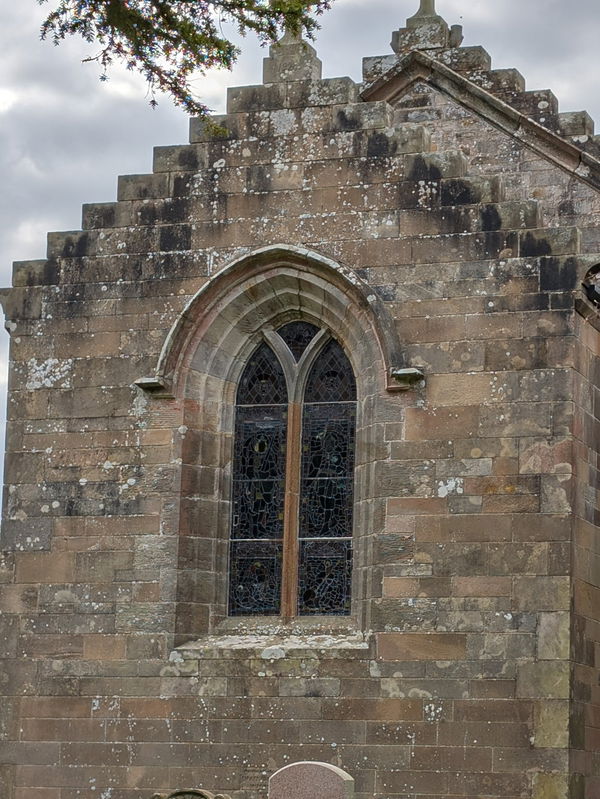 From outside you get a good view of the crow stepped gables on the eastern chancel wall with the stained glass window below.