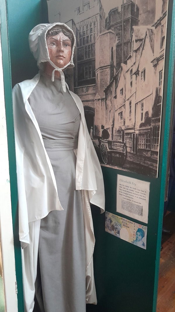There is a life-size but not necessarily life-like model of Elizabeth Fry best known for being on a £5 note and prison reformer. She was responsible for the segregation of men and women in prisons in 1823.