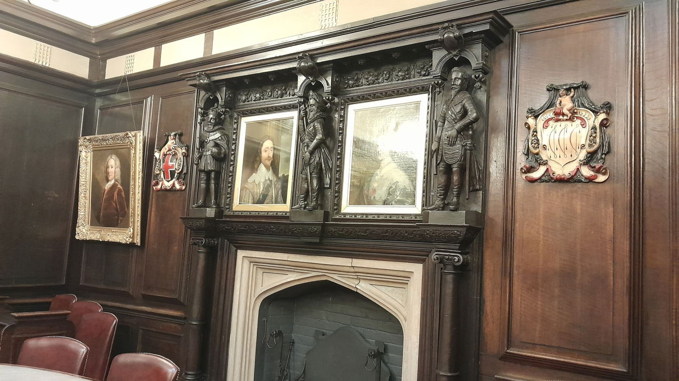The Jacobean fireplace came from a bedroom at the Hatfield College on the North Bailey. It has portraits of King Charles I and Queen Henrietta Maria. There are three finely carved figures too.