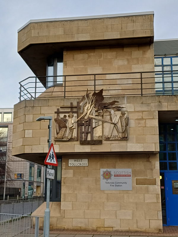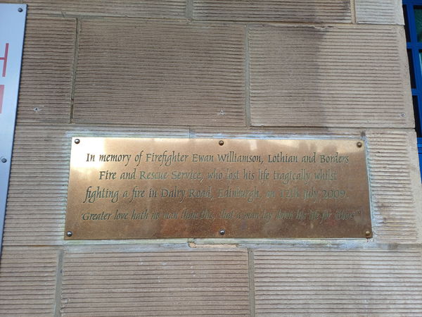 The sculpture is the work of David Roxburgh, who at the time was a student of the Edinburgh College of Art. As the dedication plaque explains, Williamson lost his life fighting this fire on Dalry Road in Edinburgh.
