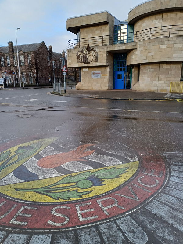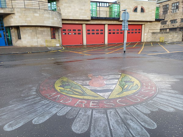Across the street from the station, the Scottish Fire and Rescue Service's badge is painted on the pavement. Even if it's quite faded, the splash of colour is an interesting lead to the colours on the station itself. The firefighter red can be found on the garage doors, while the main door is a bright blue and the window frames of the upper floor are green.