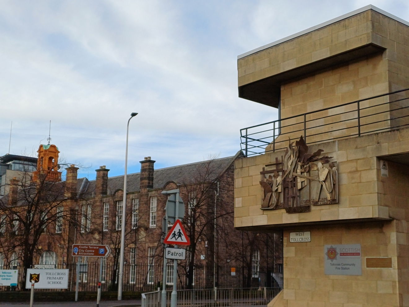 What had at first seemed to me like art deco is actually considered postmodernist architecture, and the Tollcross Fire Station has been called one of the best examples of the current in Scotland. The many colours are part of the difference between these two styles of architecture. Historic Environment Scotland gave it a Category-B listed building status in 2023. This station was designed by architect Donald William Bain and opened in 1986.