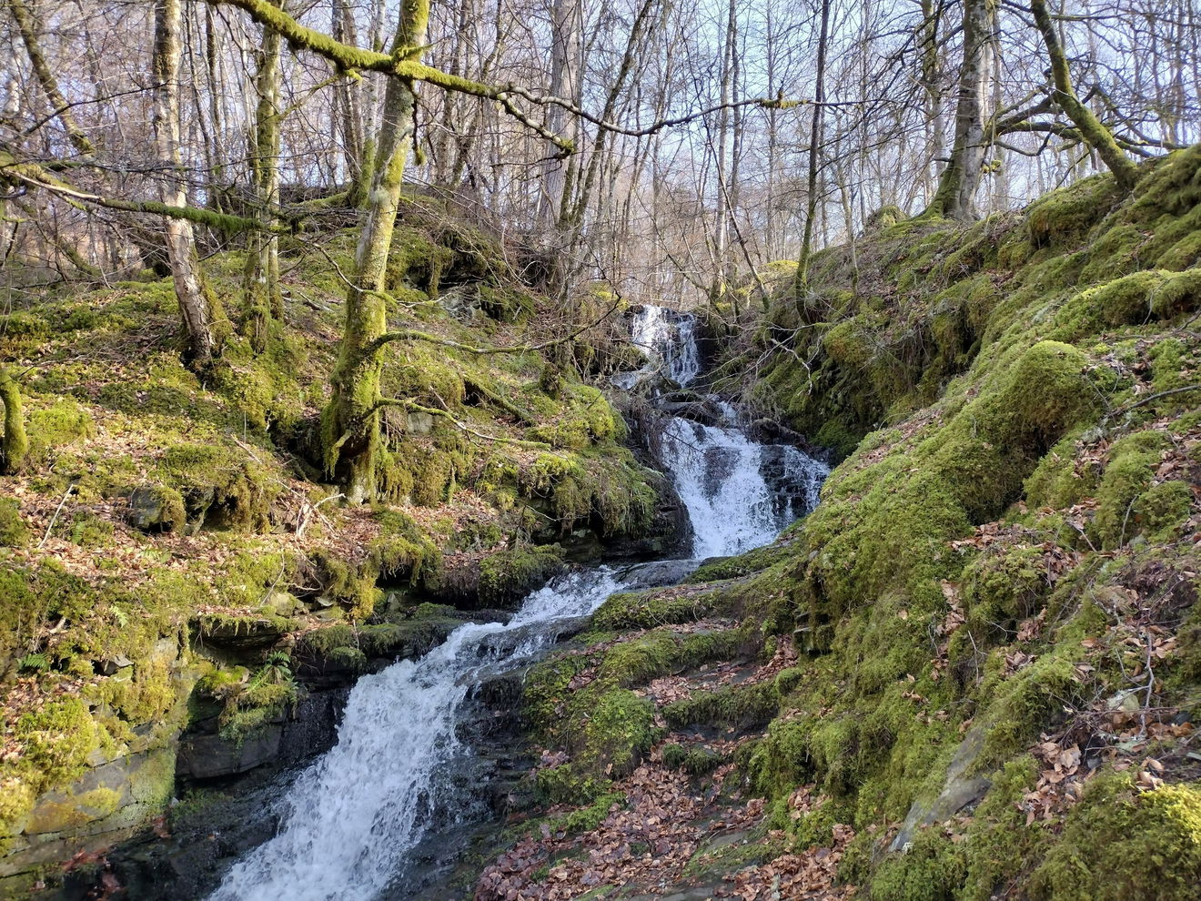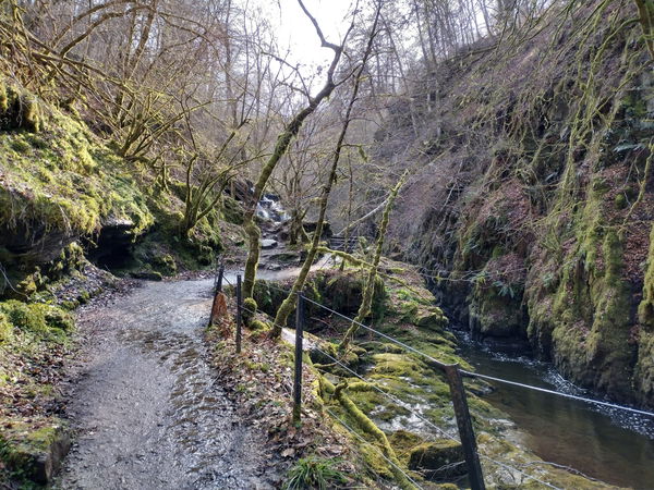 The path follows the mossy banks of the burn, while meandering through the steep wooded gorge.