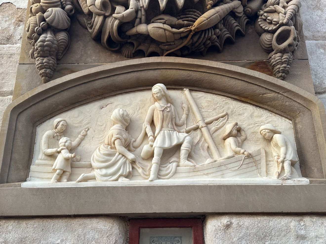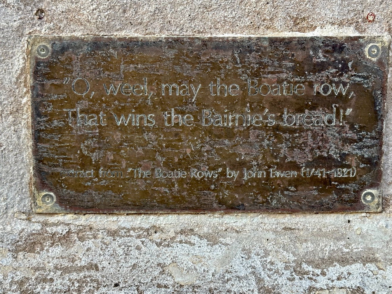 Fourteen years later, Graciela Ainsworth and colleagues made inroads with the marble and re-carved the relief of the departing fisherman and his wife. New life in an old monument. And at the bottom, an inscription by theologian John Ewen, which was a verse from his old Scots song 'The Boatie Rows'.