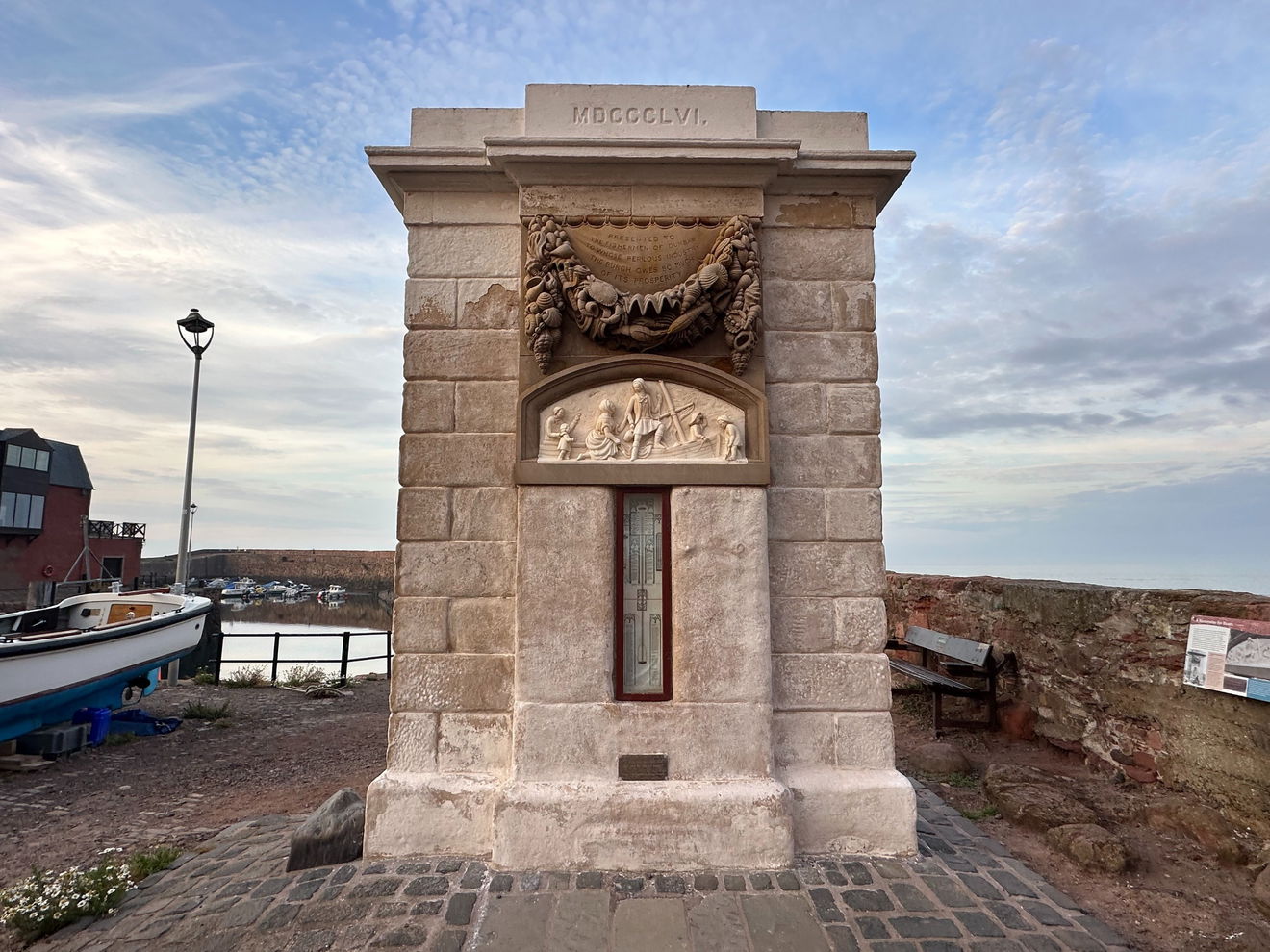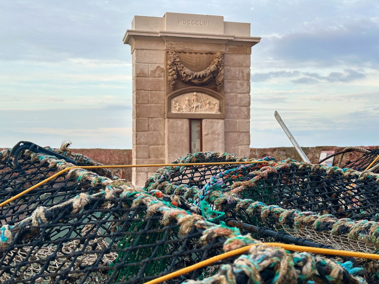 Hugging the harbour walls and kissed by fishing nets and lobster pots, he Fisherman's Monument stands as a nautical navigational aid to those attempting to avoid peril on the sea some centuries ago.