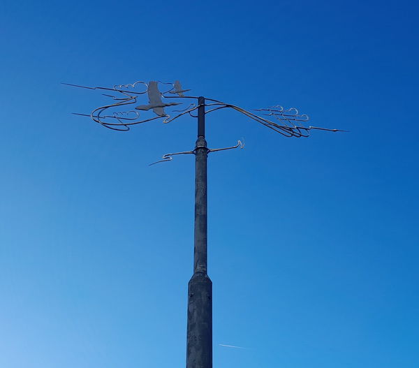 A weather vane is also called a wind vane, weathercock, and is an anemoscope, which is a device to indicate the wind direction. Leonardo da Vinci invented one. They are traditionally positioned high up, for example, on church spires. Craig depicts this one with cormorants, which are seen in the area. You can also see Craig's swirly bits, representing the wind. Weathervanes need to be balanced so they are streamlined with the wind and will not simply rotate like a whirling dervish.