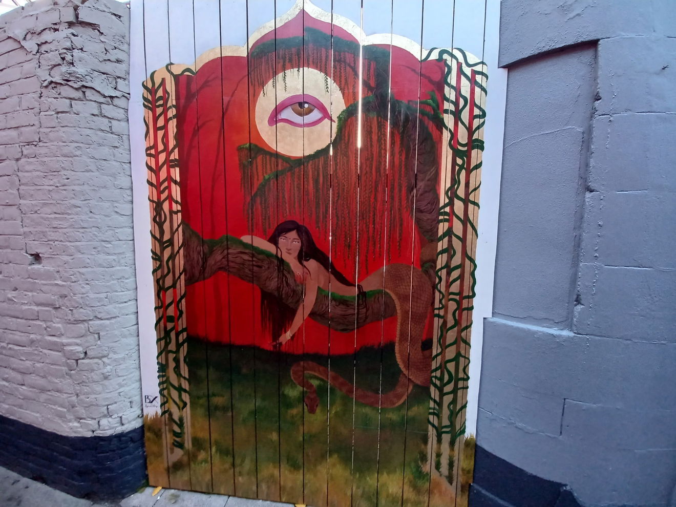 Back on Forth Lane, Bex Masters has created “Kundalini” which explores reflection and renewal through feminine energy and transformation. Bex explained it was “Inspired by my multicultural upbringing and heritage, this mural explores the concept of a Pleasure Garden through the eyes and hands of a person of colour”.