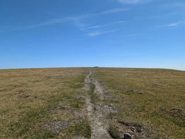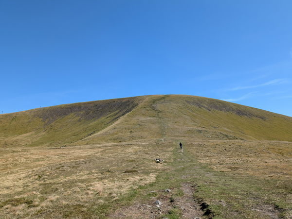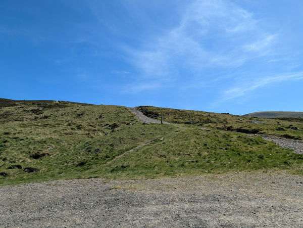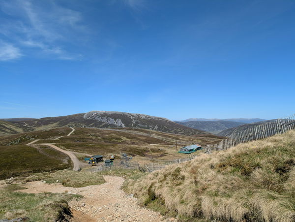 Pass the cairn next to the path, continuing up the large track running past the ski run and buildings.