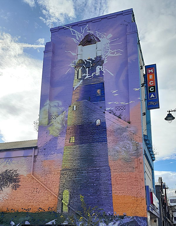 The building was opened in 1932 as a Art Deco Regent Theatre with plush fixtures and fittings. It then became a cinema in 1955 and then a bingo hall, which is now closed. It looks like the building will eventually be demolished. However, the House of Light mural fits well on the side wall, and it is not by accident that the lantern at the top features an Art Deco window, as shown in this super capture by our Fabulous Norther Lorraine London.