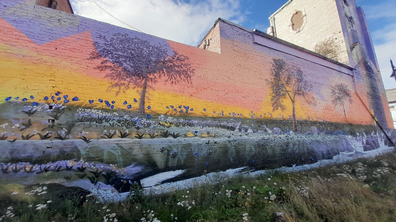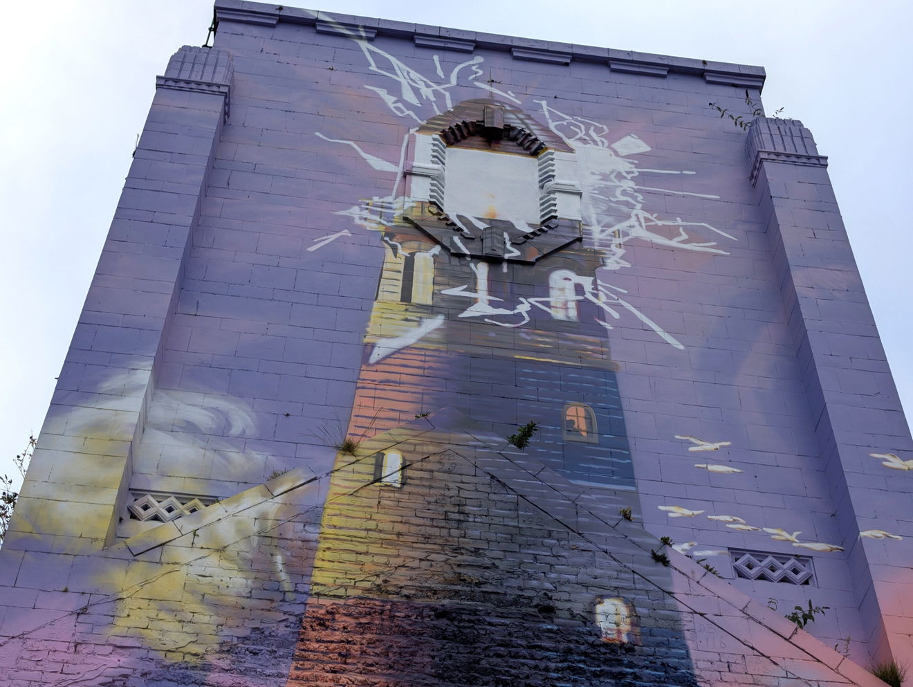 A large-scale mural bursting with energy, depicting Roker Lighthouse.