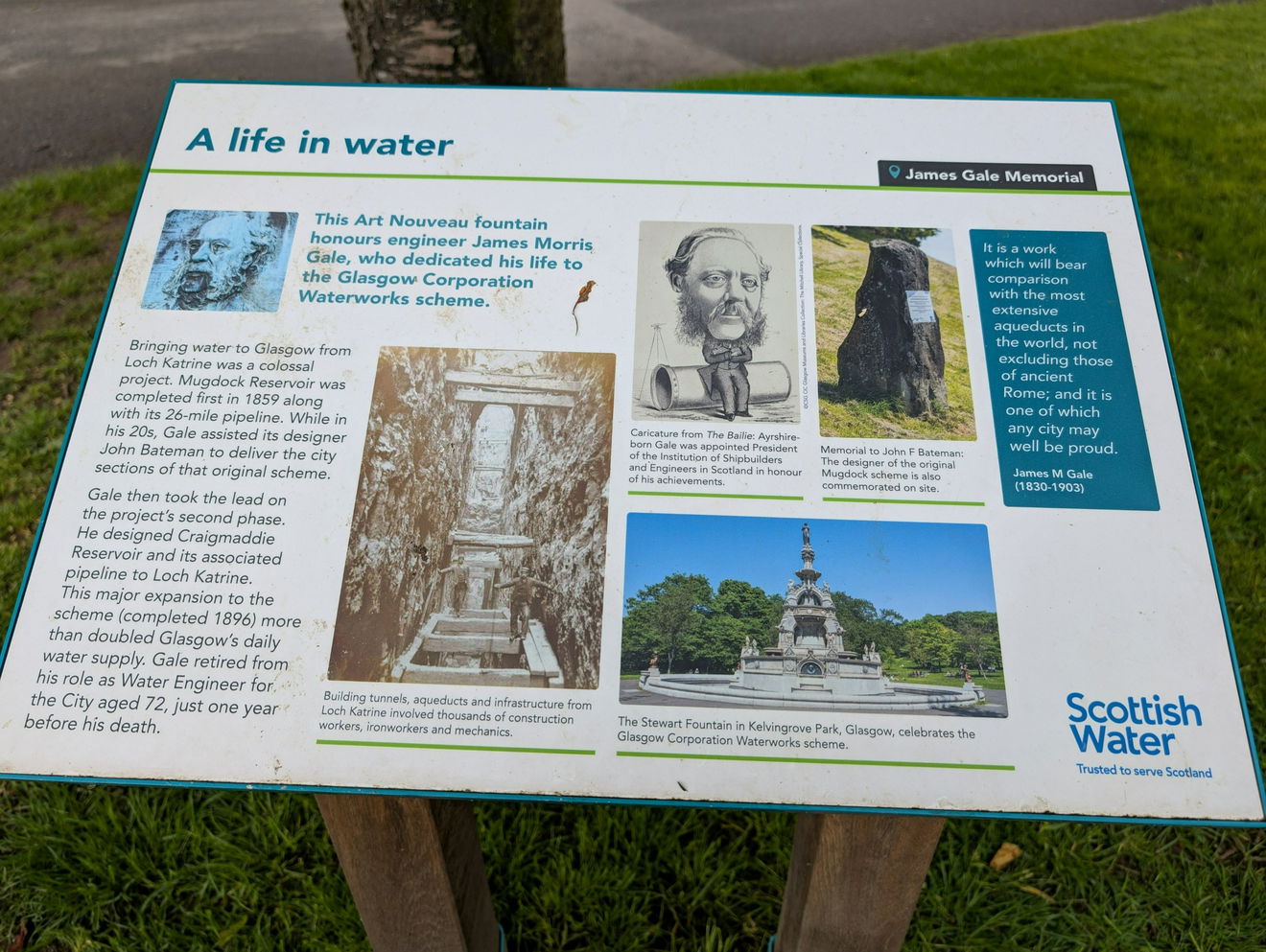 The James M Gale Memorial Fountain can be found next to the Mugdock and Craigmaddie Reservoirs. The position of the fountain was no accident, as the reservoirs were essential to the water supply for which Gale helped provide.