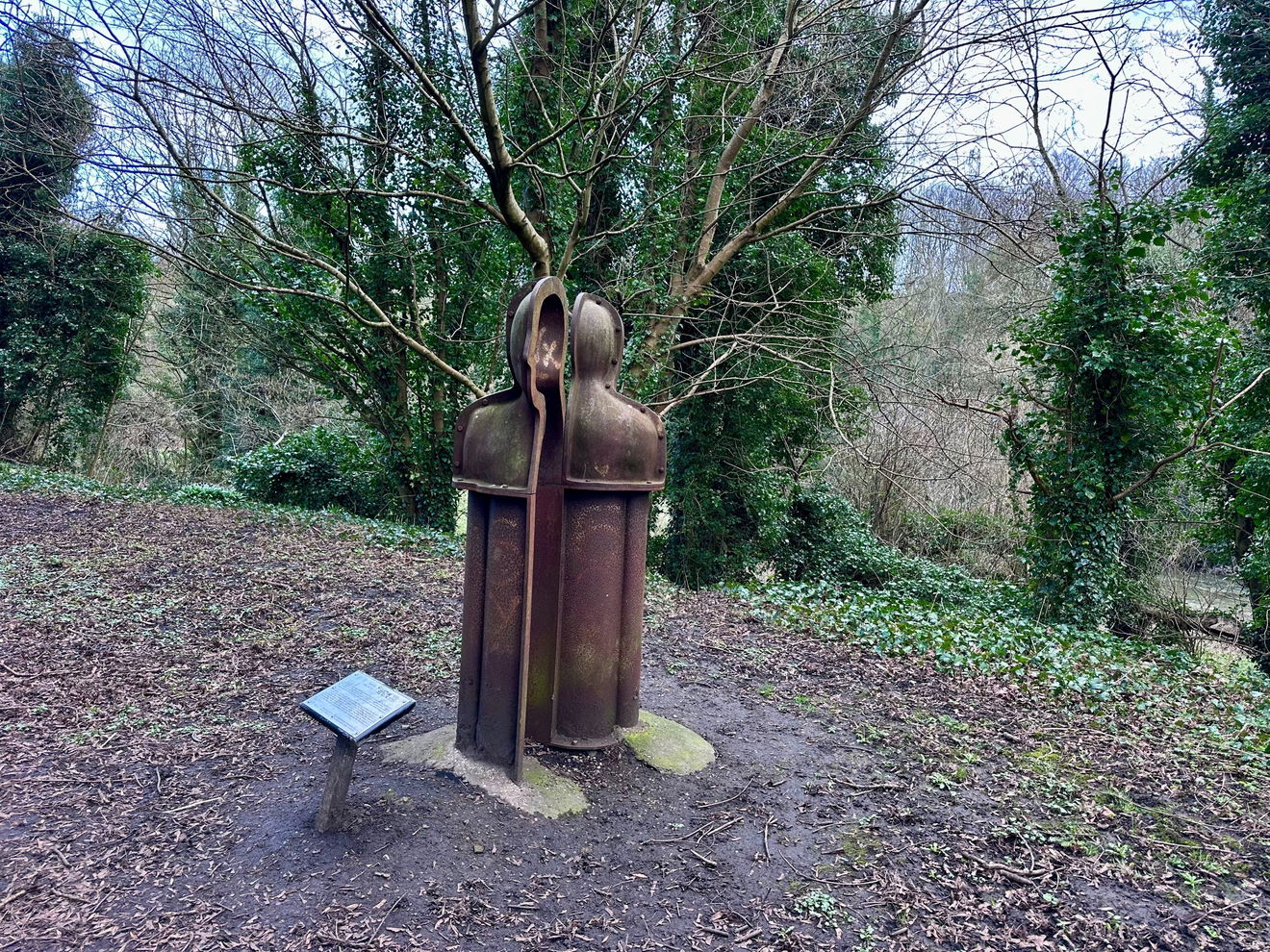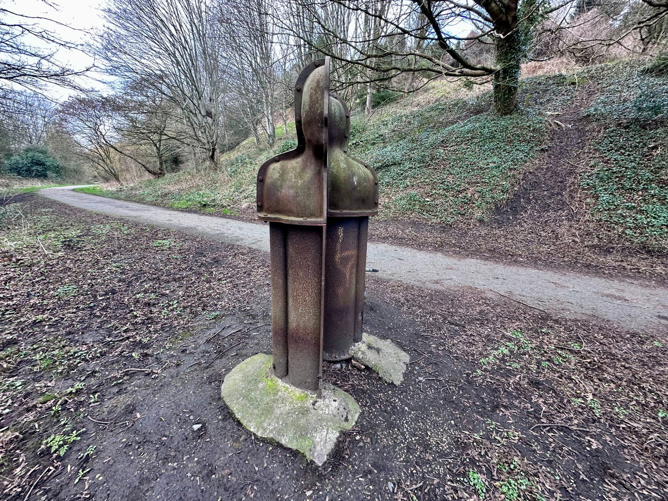 A bold piece of public art standing quietly above the River Blyth in Bedlington Dene, near the site of the historic Bedlington Iron & Engine Works.