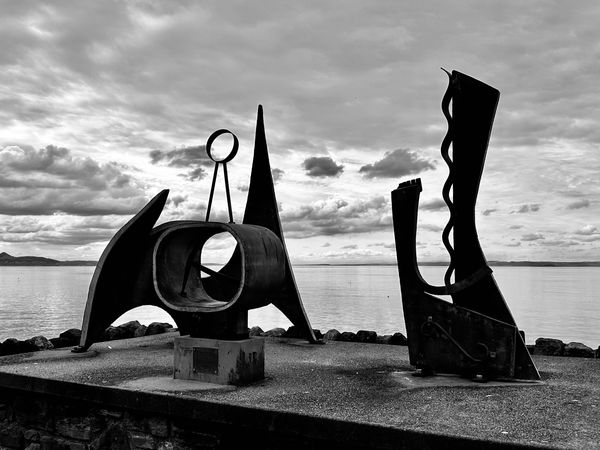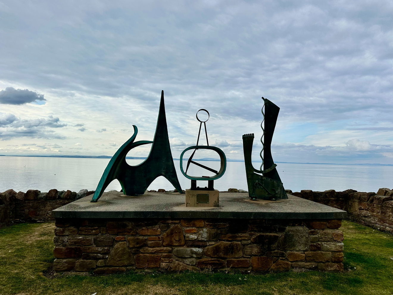 On closer inspection, there are three individual, but interconnected metal shapes which huddle together on a concrete surface, a table of unusual and abstract shapes. Enhanced by their North Sea skyscape, they are evidently intentionally placed here and are supposed to be viewed in sight of the sea and sky.