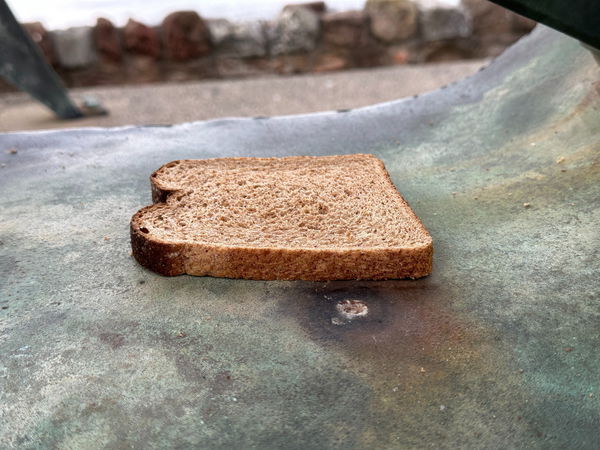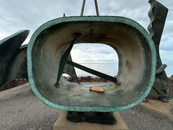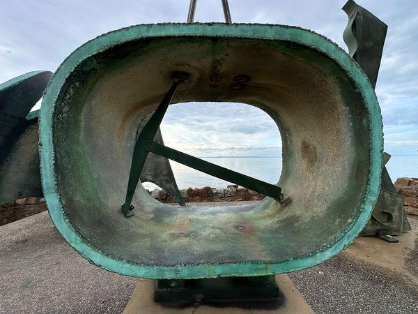 Moving to the round-edged centre piece, it looks to me like a sextant, measuring the ship's latitude and longitude between the sun, the stars and the horizon, or a compass, seeking direction at sea. But look inside...right inside. There's a pick...and an arbitrary slice of brown bread. Someone's been feeding the gulls, or the gulls have been untidy diners and left their spoils on this sculpture.